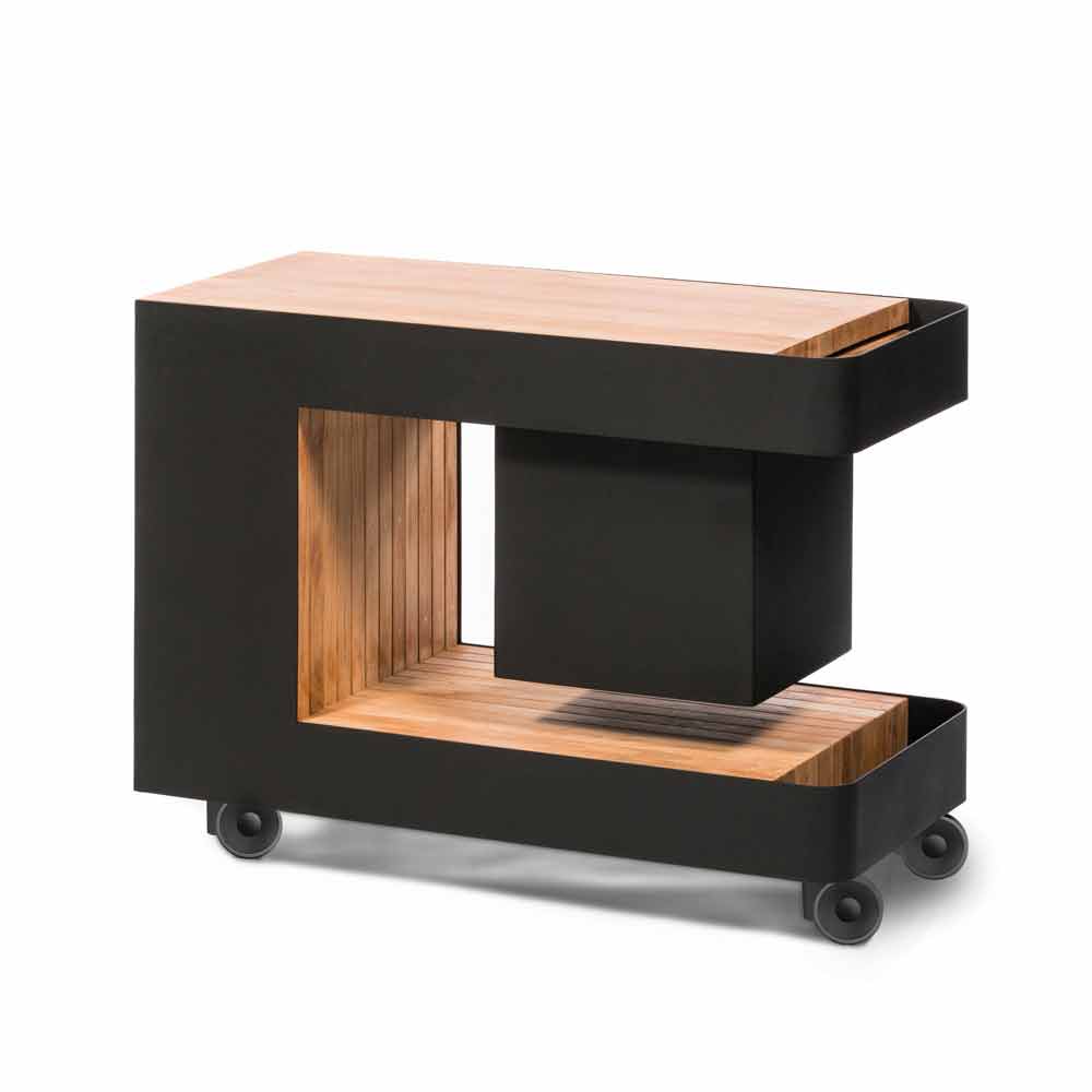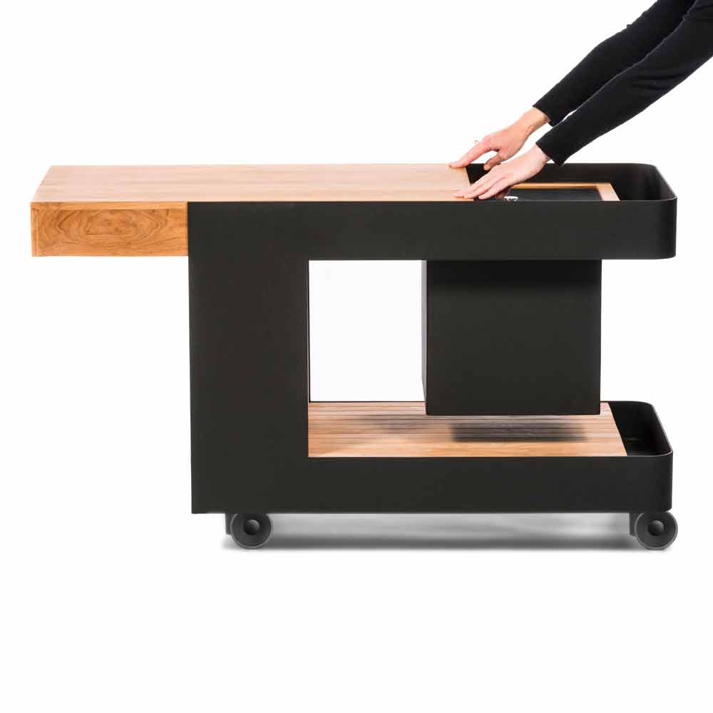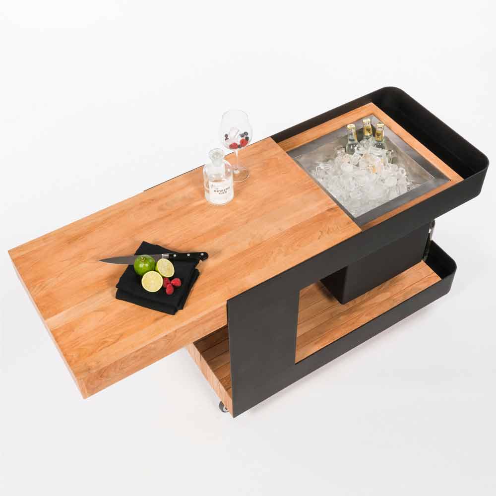 Mobiele bar op wielen voor buiten met tafel, modern design, gemaakt van hout en staal, hoge kwaliteit.