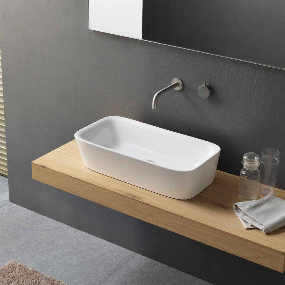 Wastafel in wit keramiek, modern rechthoekig ontwerp met hoge en afgeronde hoeken, gemaakt in Italië.