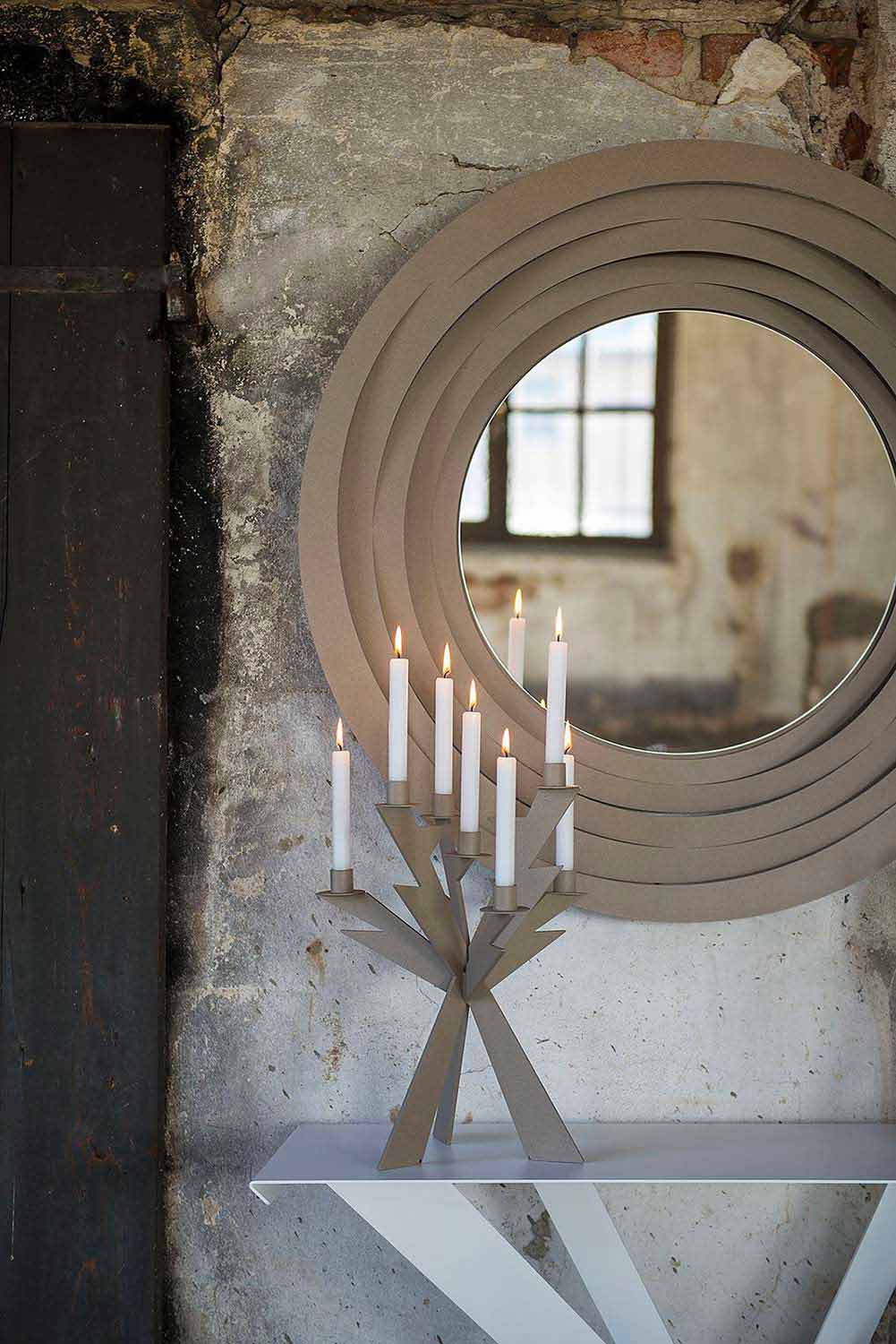 De Oregano ronde wandspiegel is volledig met de hand gemaakt door Italiaanse ijzeren ambachtslieden, verkrijgbaar in verschillende kleuren: