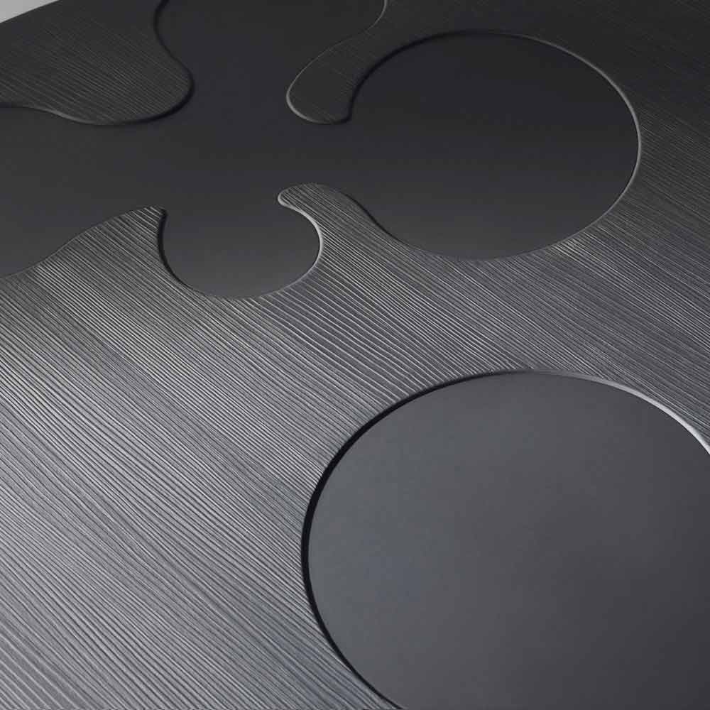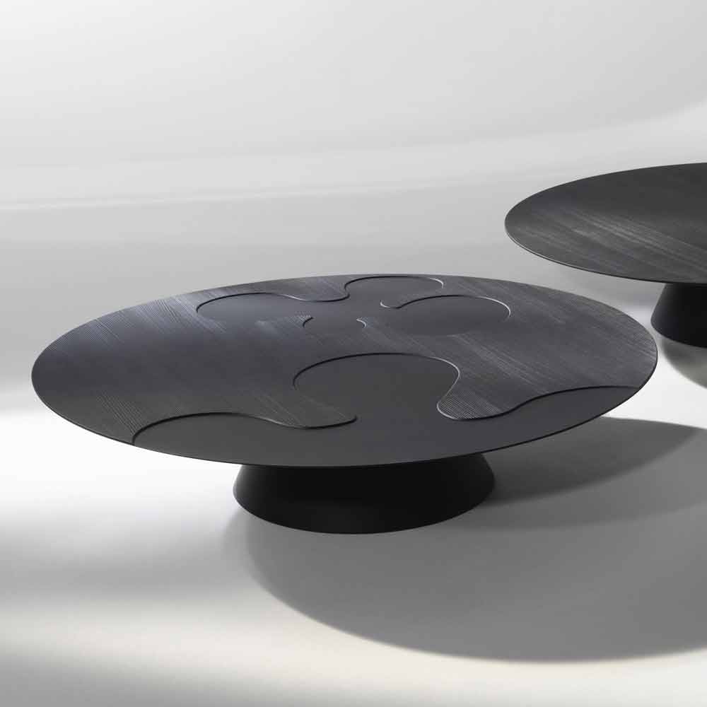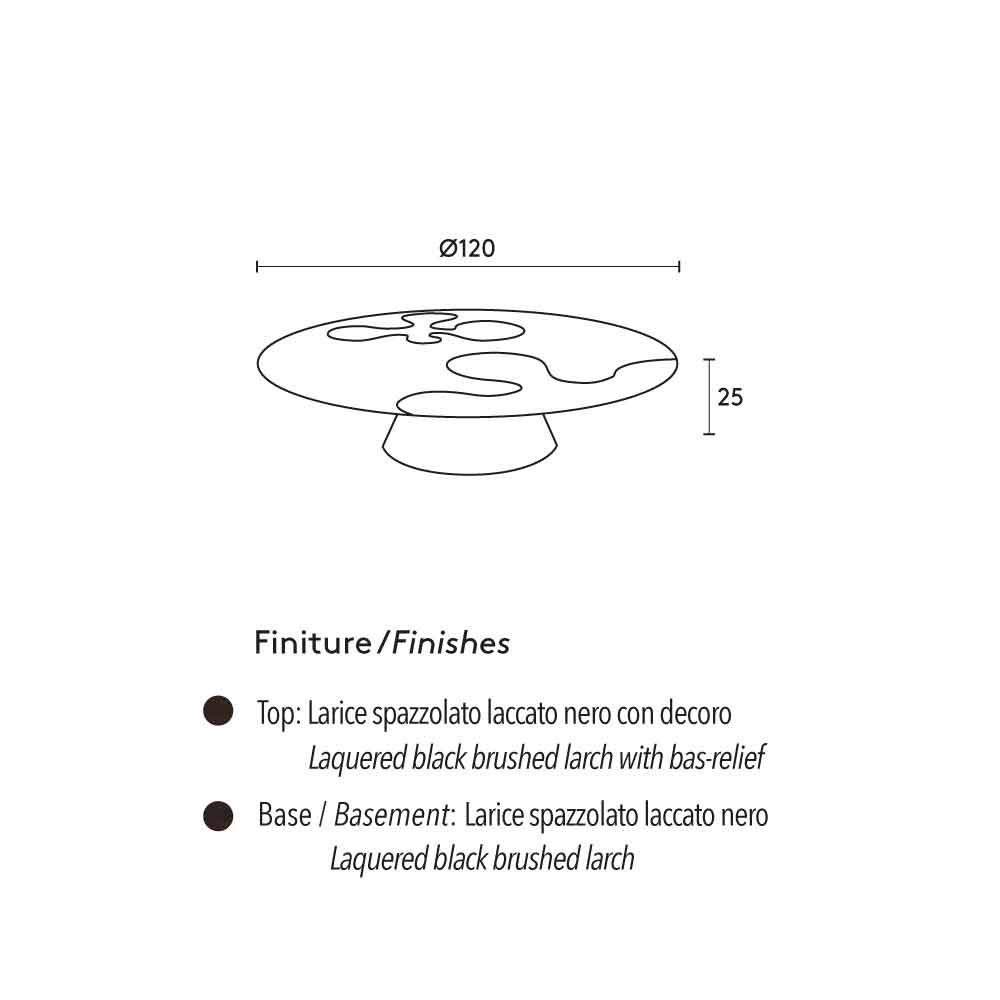 Salontafel gekenmerkt door een konisch zwart gelakt geborsteld lariks. Piano Black gelakt geborsteld lariks met decorum.