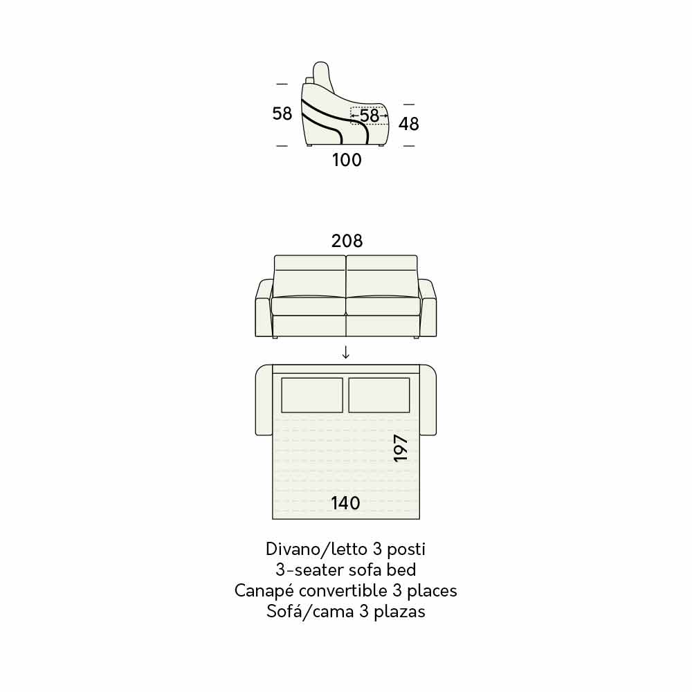 - L 208 x P 100 x H 104 cm (matras: L 140 x P 197 x H 14 cm);