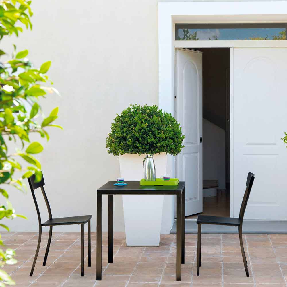 Vierkante buitentafel van gepoedercoat gegalvaniseerd ijzer, zelfnivellerend en stapelbaar, Made in Italy.