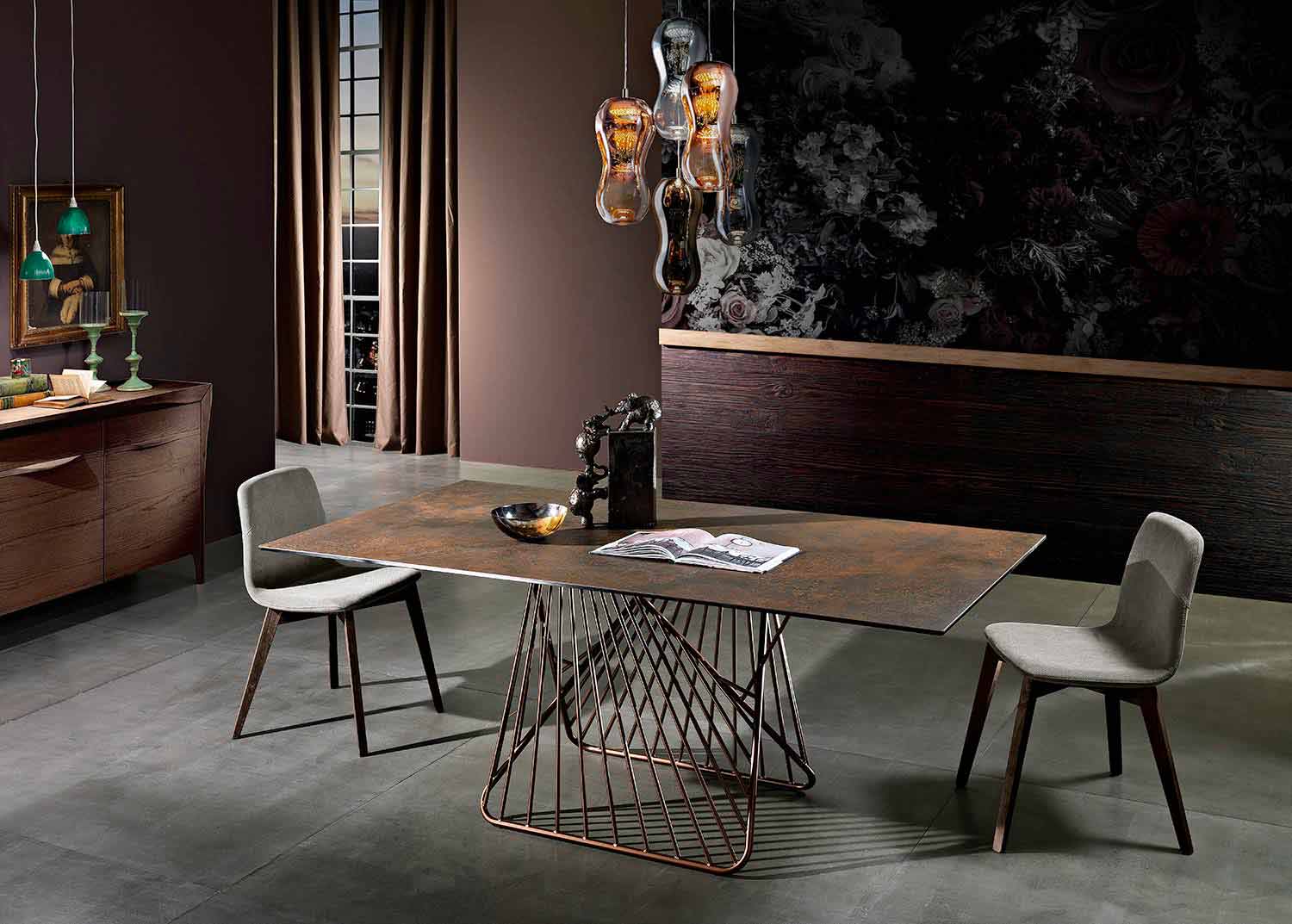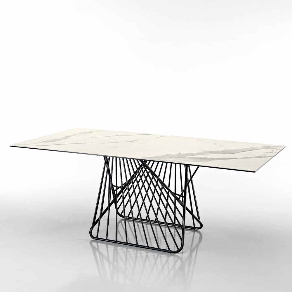 Mitia is een vaste tafel gerealiseerd in Italië met een gelakte metalen voet en een glas-keramiek oppervlak .