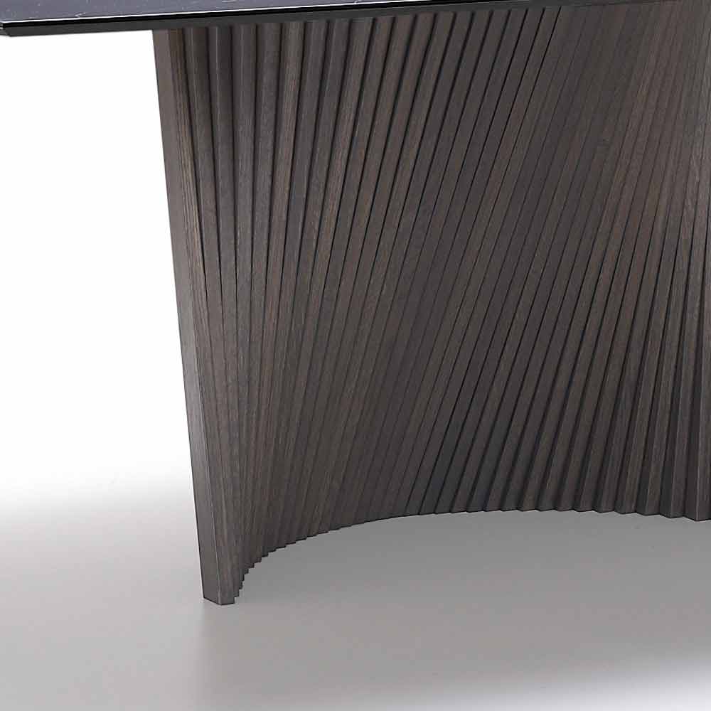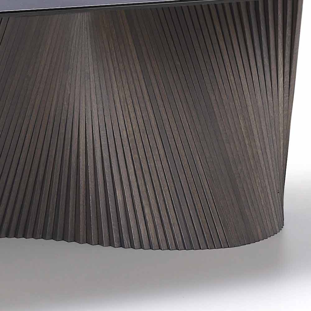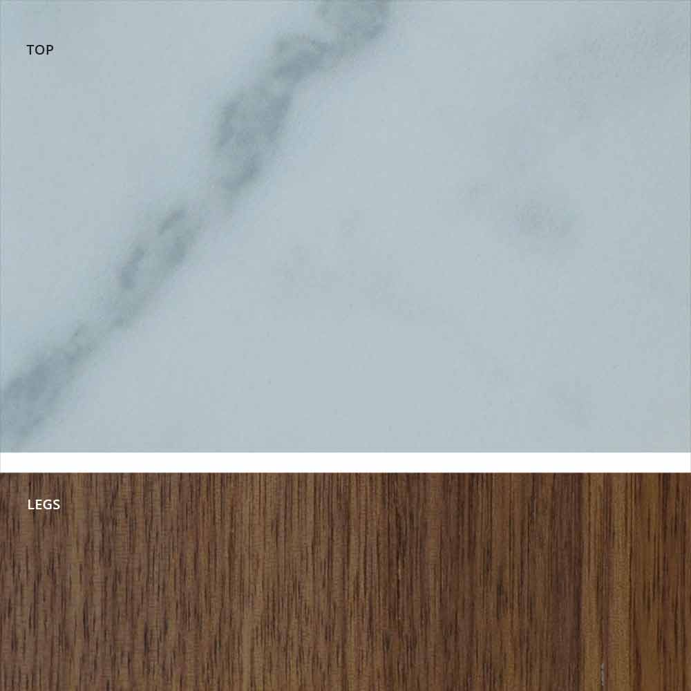 - basis bestaande uit meer dan 70 lamellen in met de hand geolied essenhout in walnoothout en bovenblad in de vorm van semi-vat in steengoed in ondoorzichtig wit marmer van statuario.