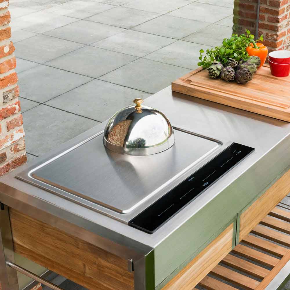 Buitenkeuken op wielen in roestvrij staal en teakhout, twee maten modern design met verwisselbare platen.