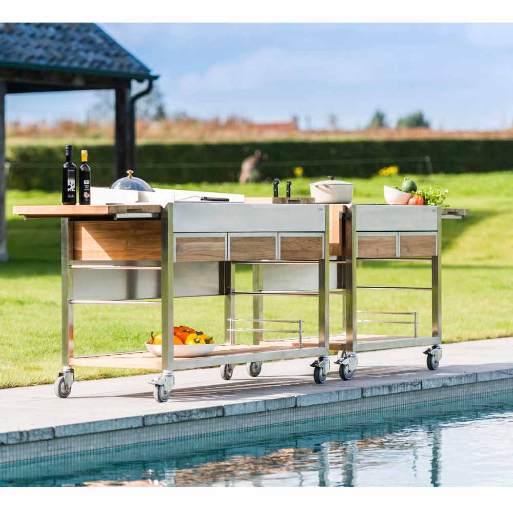 Het is een buitenkeuken op wielen die zich kenmerkt door een stevige constructie waarbij gebruik is gemaakt van geborsteld RVS en massief Teak hout, die je overal kunt plaatsen: in de tuin, op het terras of bij het zwembad, voor een luxe en trendy effect.