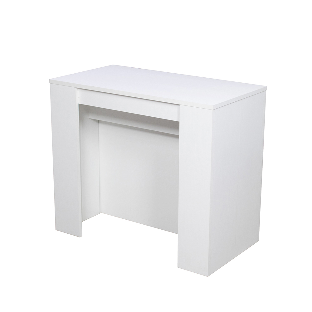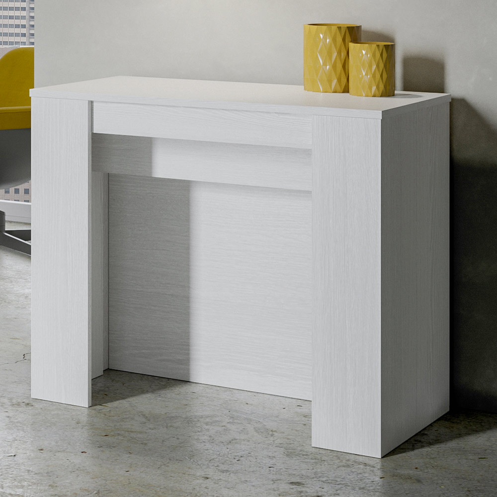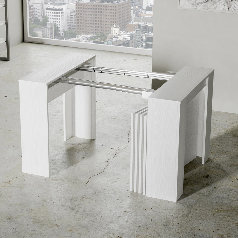 Laat u betoveren door de zuiverheid en de functionaliteit van deze uittrekbare consoletafel, een meubelstuk dat de kwintessens van veelzijdigheid modern vertegenwoordigt.