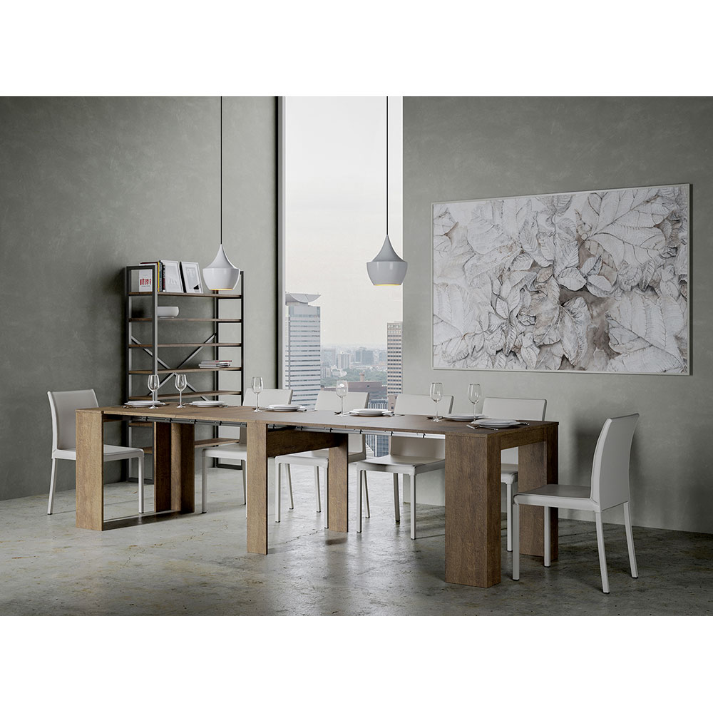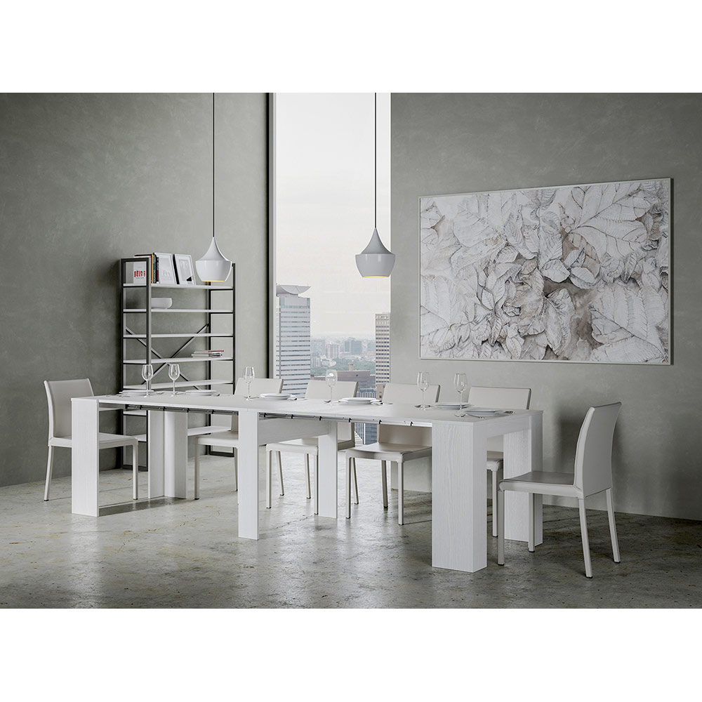 Het functionele ontwerp bevat uitbreidingen, een detail dat de praktische verbetert zonder aan stijl in te boeten: in slechts een paar bewegingen verandert de consoletafel van een elegant opbergmeubel in een ruime tafel, klaar om gasten te ontvangen voor gedenkwaardige diners of om te dienen als een groot werkoppervlak.