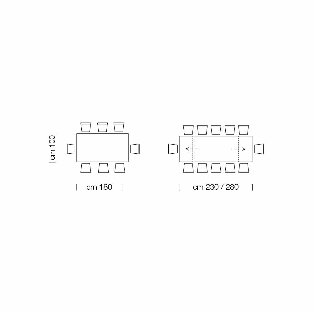 - L 180 (280) x D 100 x H 75,8 cm 12-zits uitschuifbaar met 2 externe verlengstukken van 50 cm;