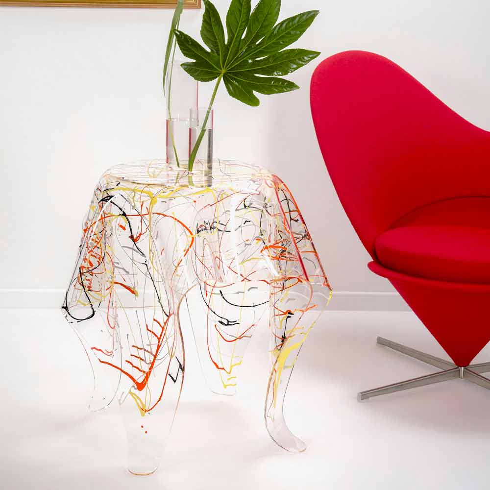 Plexiglas meerkleurige salontafel gemaakt in Italië, Otto De gedrapeerde Otto-tafel is een uniek stuk, een werk van moderne kunst. Een 100% zuivere polymeerfolie in zuiver PMMA-plexiglas met verfspray, met de hand gedrapeerd bij hoge temperaturen, om een unieke en onverteerbare tafel te creëren.