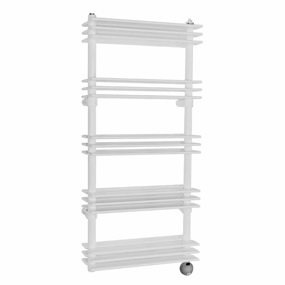 elektrische radiator heeft een multifunctioneel ontwerp bestaande uit verticale buizen en horizontale platen die de functie van echte planken kunnen vervullen.