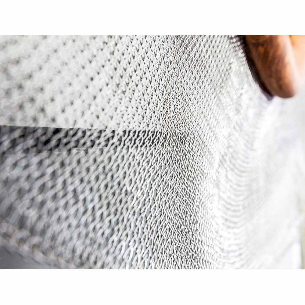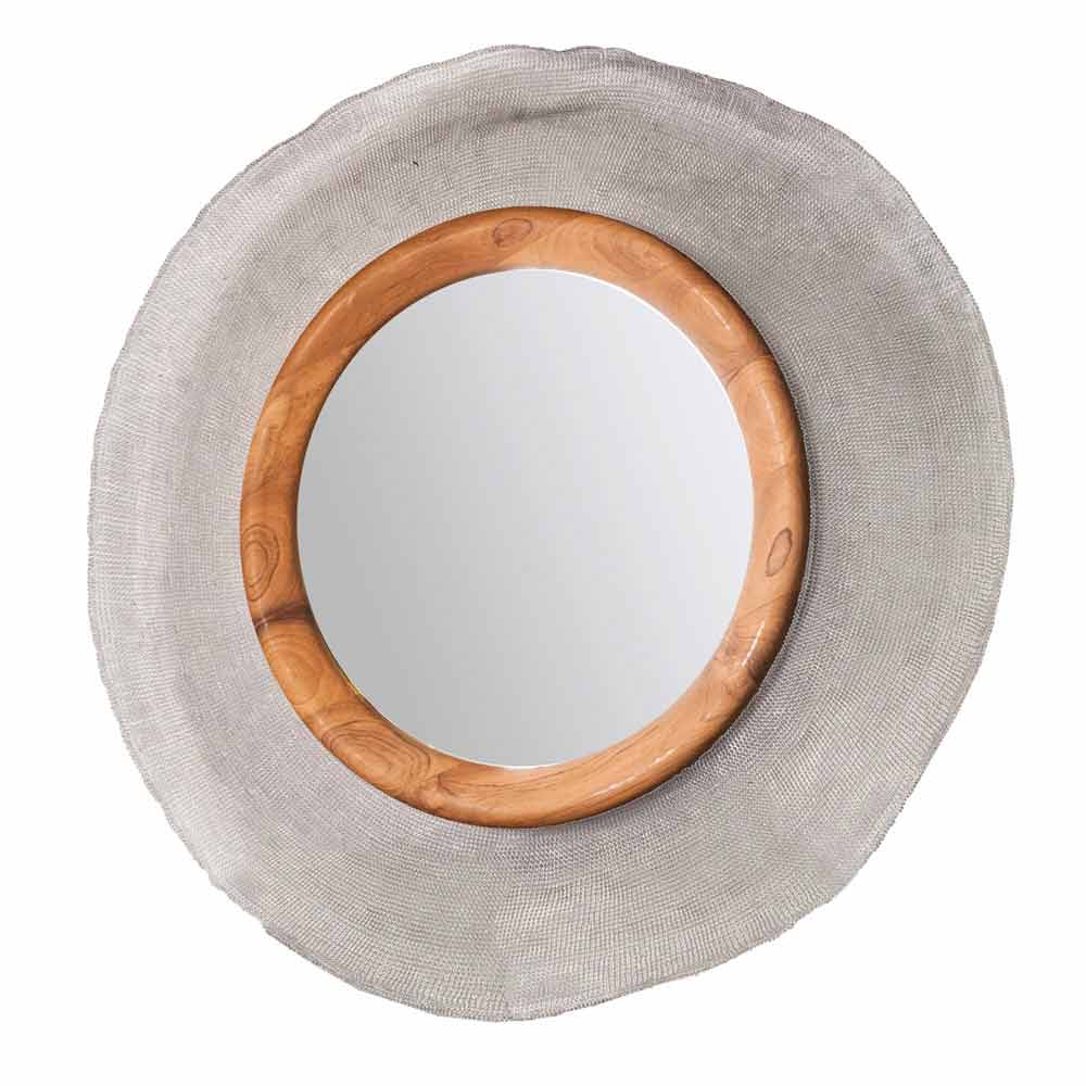 Gemaakt met een handgeweven metalen gaas en aangebracht langs het gepolijste teak frame van de spiegel; het gaas kan naar wens worden gevormd.