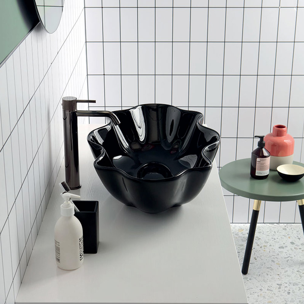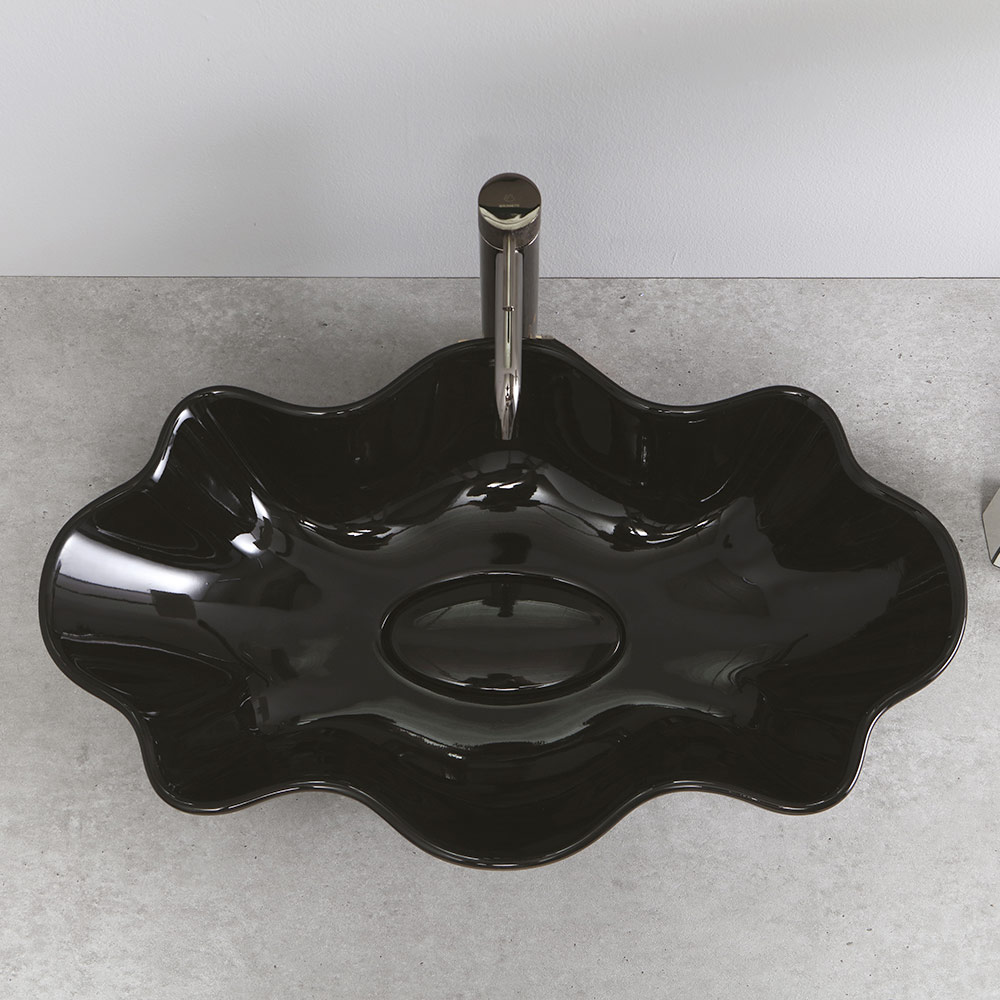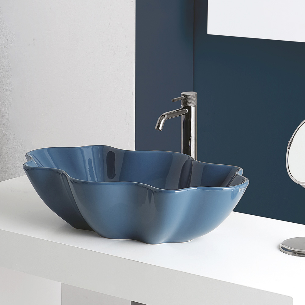 Voorgevormde wastafel voor de badkamer in gekleurd keramiek met een glanzende afwerking gemaakt in Italië door middel van een ambachtelijke productie . Een origineel en boeiend ontwerp dat voortkomt uit de wens om inrichtingsoplossingen voor te stellen ver van de klassieke serieproducten. Het resultaat is een wastafel met een exclusieve esthetiek die de aandacht trekt dankzij zijn imposante moderne persoonlijkheid en de bijzondere vorm die doet denken aan een schelp.