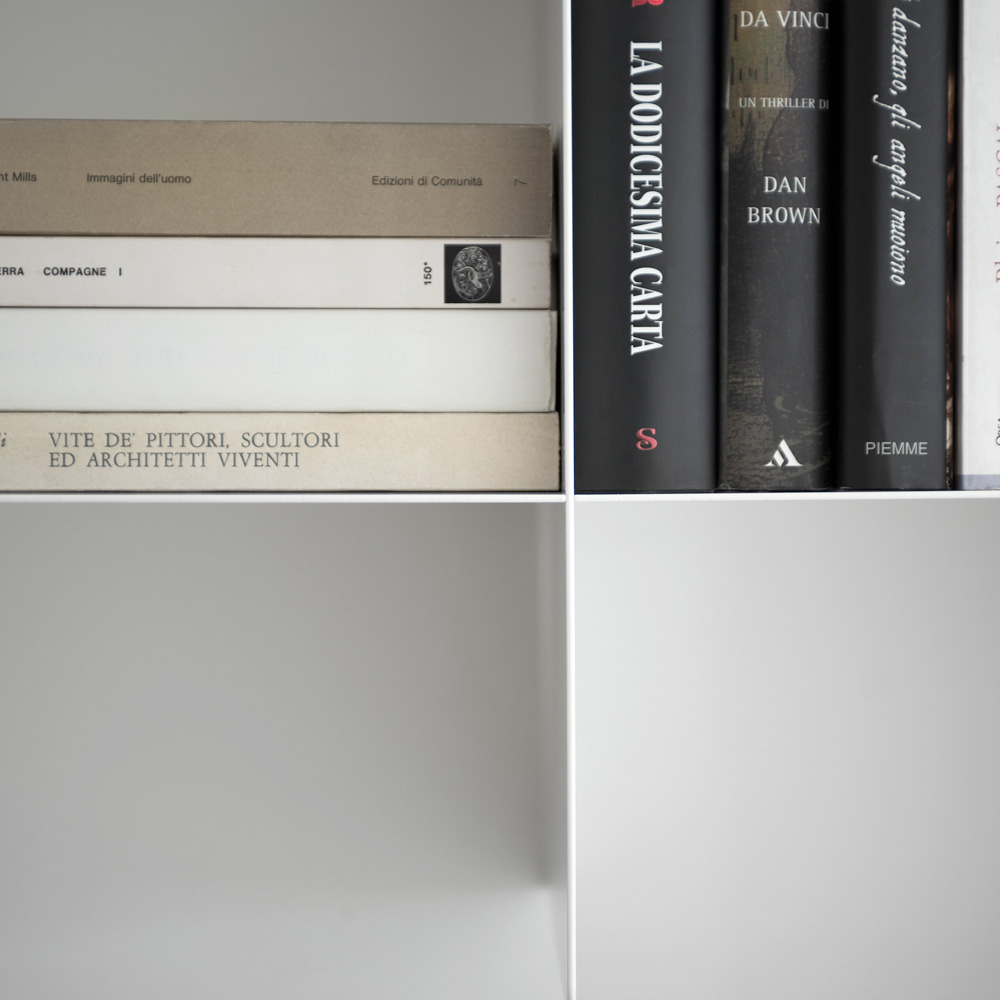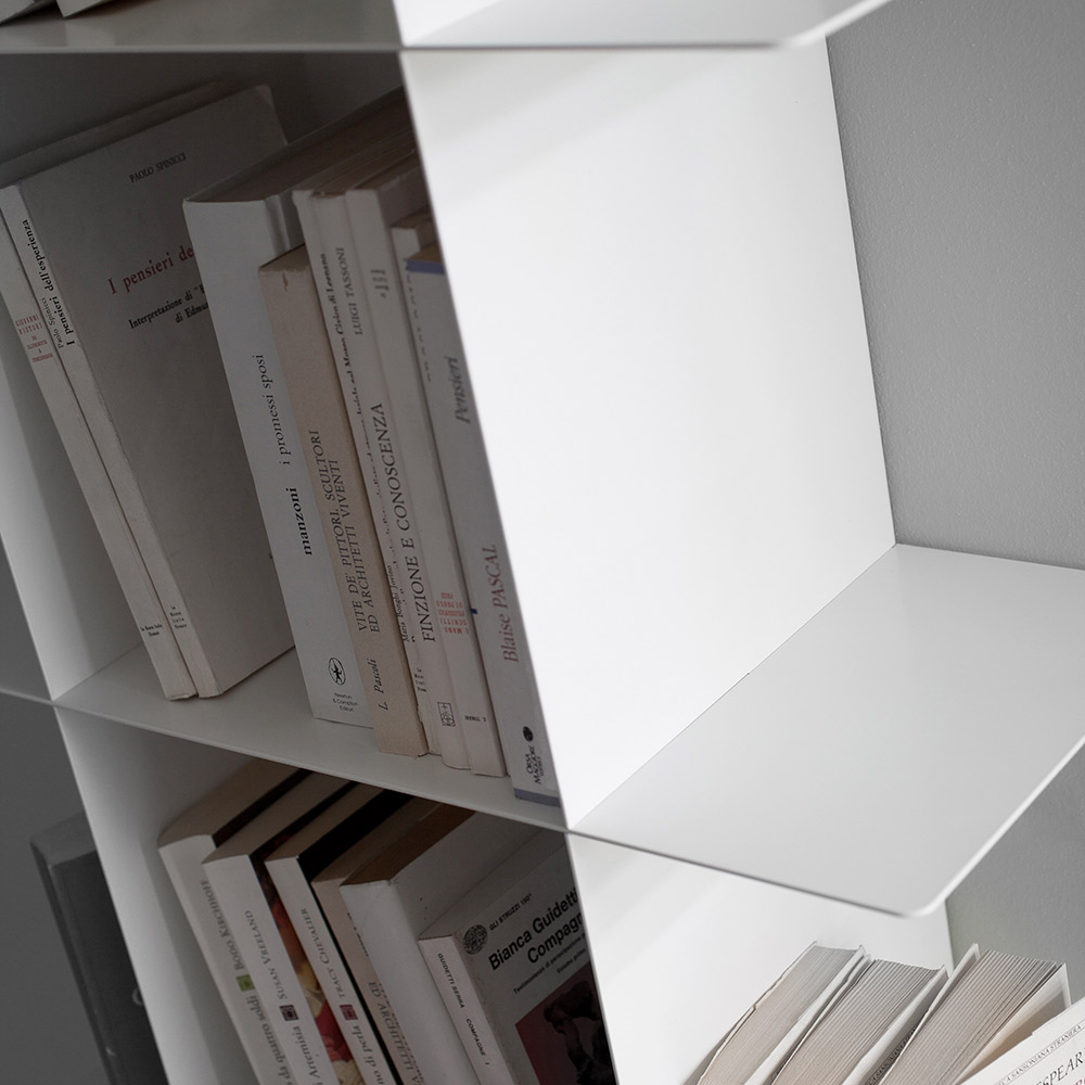 Het resultaat is een lineair en strak product , met dunne en robuuste lijnen tegelijk, waardoor je met kleuren kunt spelen: op verzoek is het namelijk mogelijk om de kleuren van de ondersteunende module te diversifiëren van die van de planken, waardoor verschillende chromatische situaties afhankelijk van het meubilair.
