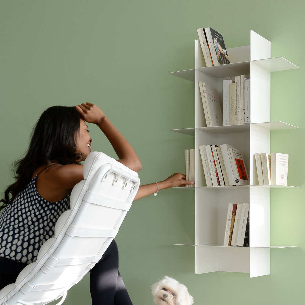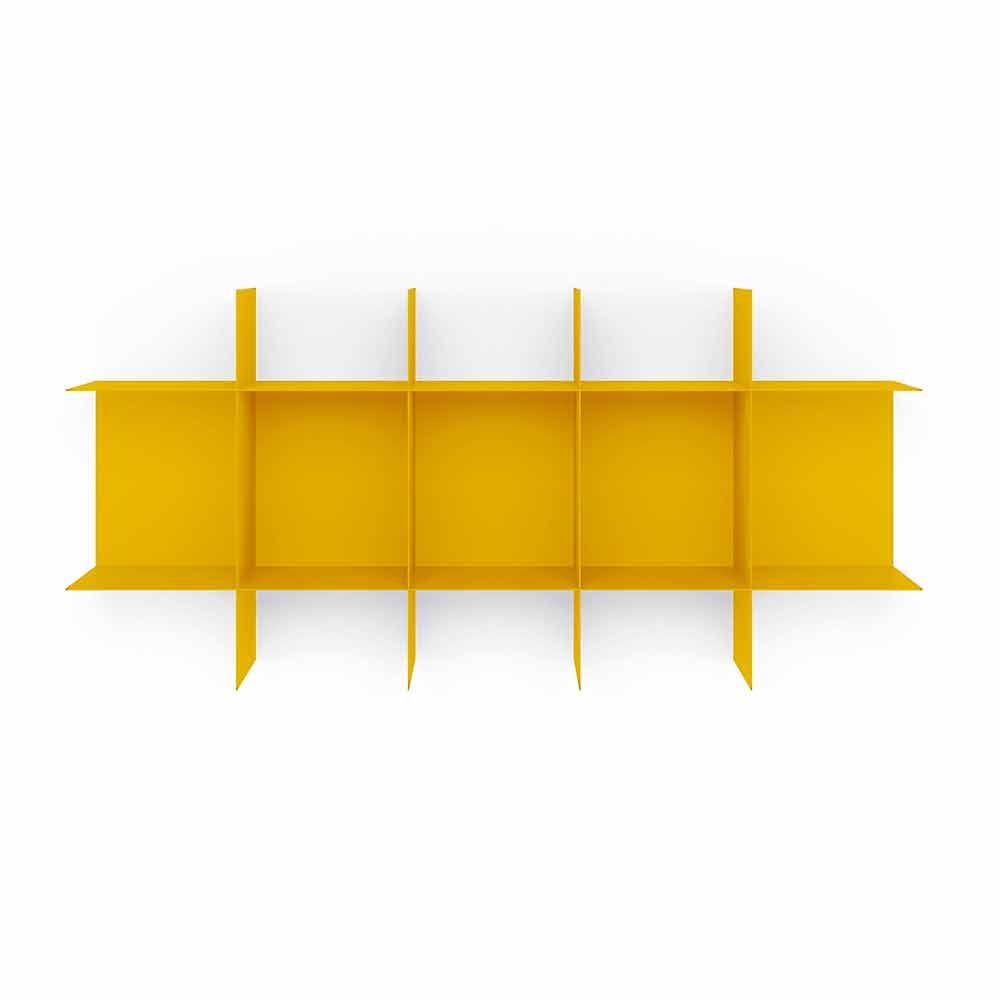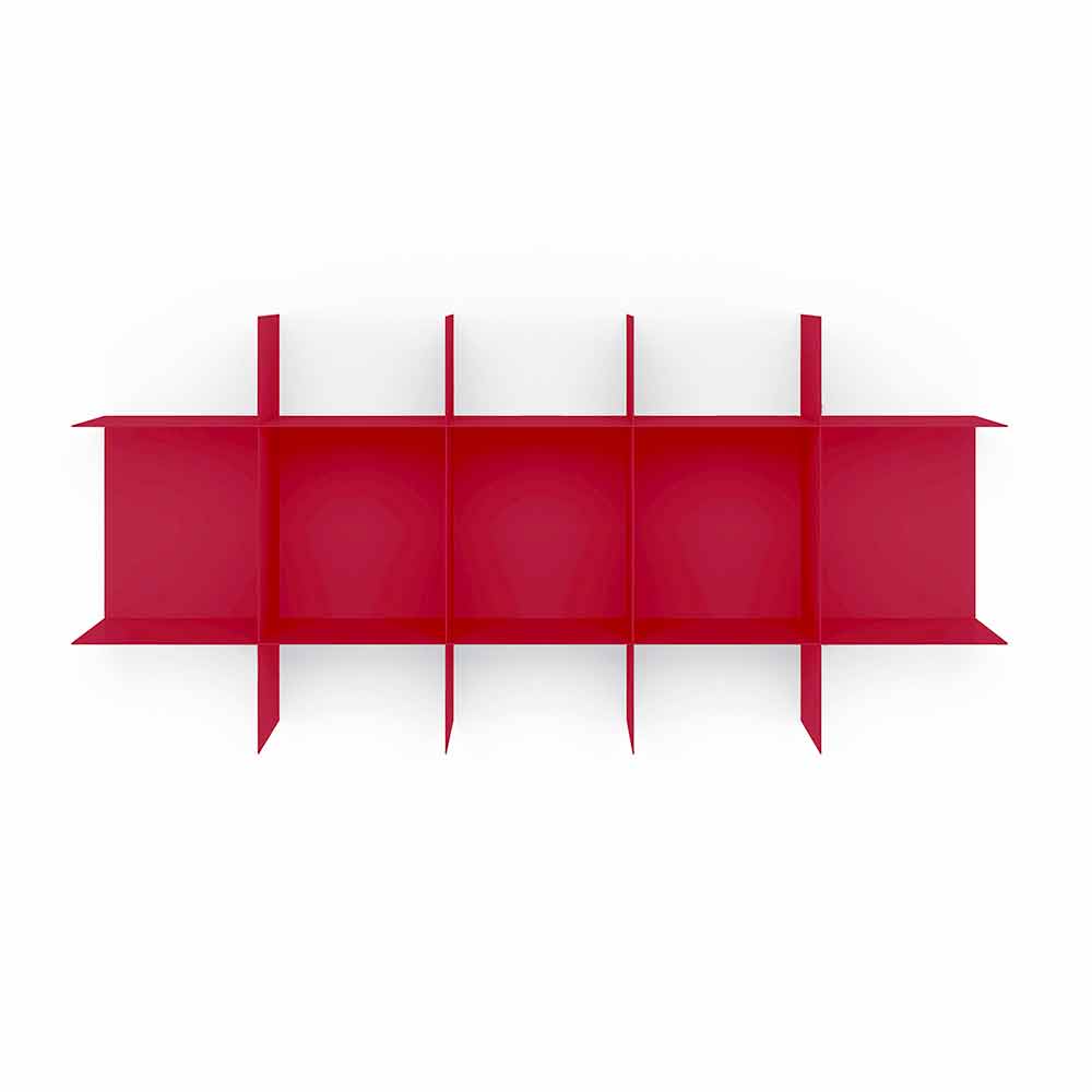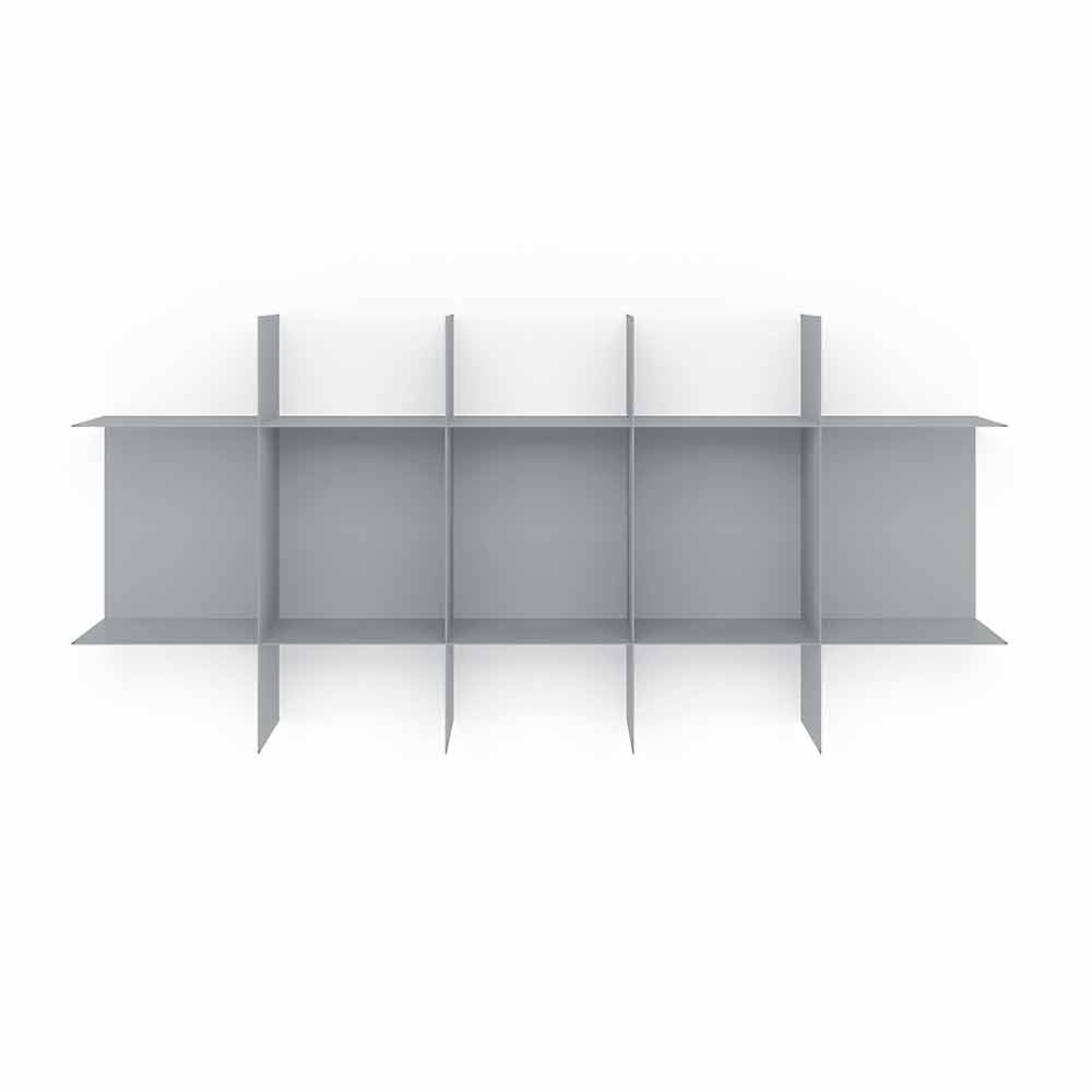 Deze modulaire stalen boekenkast bestaat uit een centrale basismodule die aan de muur moet worden bevestigd en vier planken die perfect in de module passen en een patroon van vierkante compartimenten vormen, met een geometrisch en eigentijds ontwerp , elegant en verfijnd in zijn eenvoud.