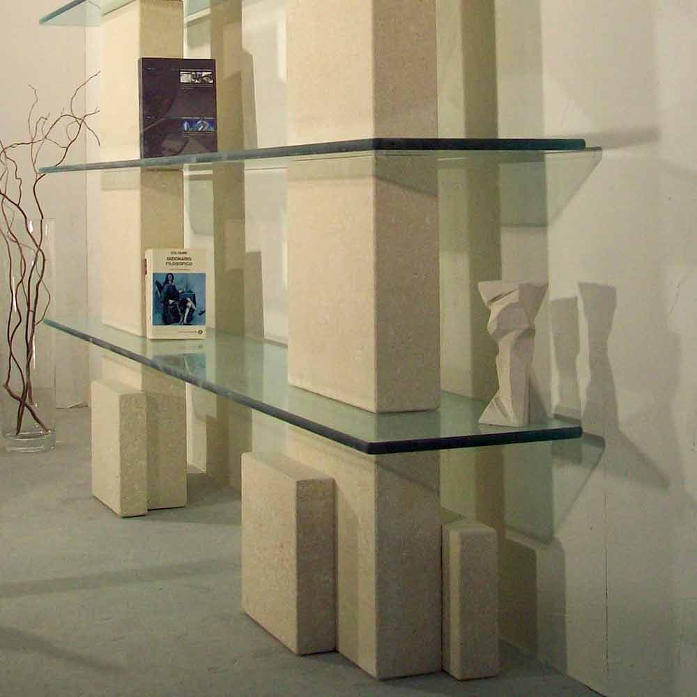 Modulaire boekenkast Gemaakt in Italië in steen en glas. Een lineaire en essentiële samenstelling die met zijn schone en gepolijste oppervlakken elk compromis met de sculpturale en decoratieve vormen elimineert. De Poplia-boekenkast laat zien dat Vicenza-steen een modern, helder en warm materiaal is, de structuur bestaat uit modulaire elementen van 35 cm hoog met 4 glazen planken met ruwe randen. Een interne veiligheidsstructuur zorgt voor maximale stabiliteit van de constructie.