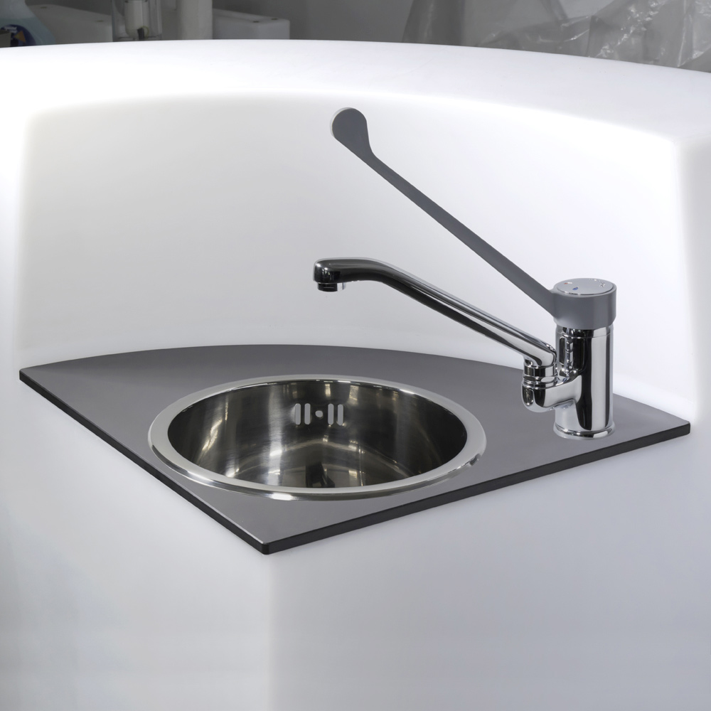 handenwasset bestaat uit een voorgeboord antracietkleurig HPL-blad, mengkraan, spoelbak en afvoersysteem.