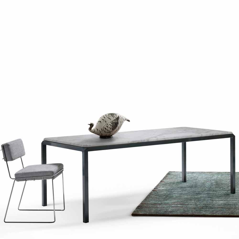 De nauwgezette aandacht voor detail, de kwaliteit van de afwerking, het contrast tussen de ijzeren structuur en het marmeren blad kenmerken de Bebop tafel.