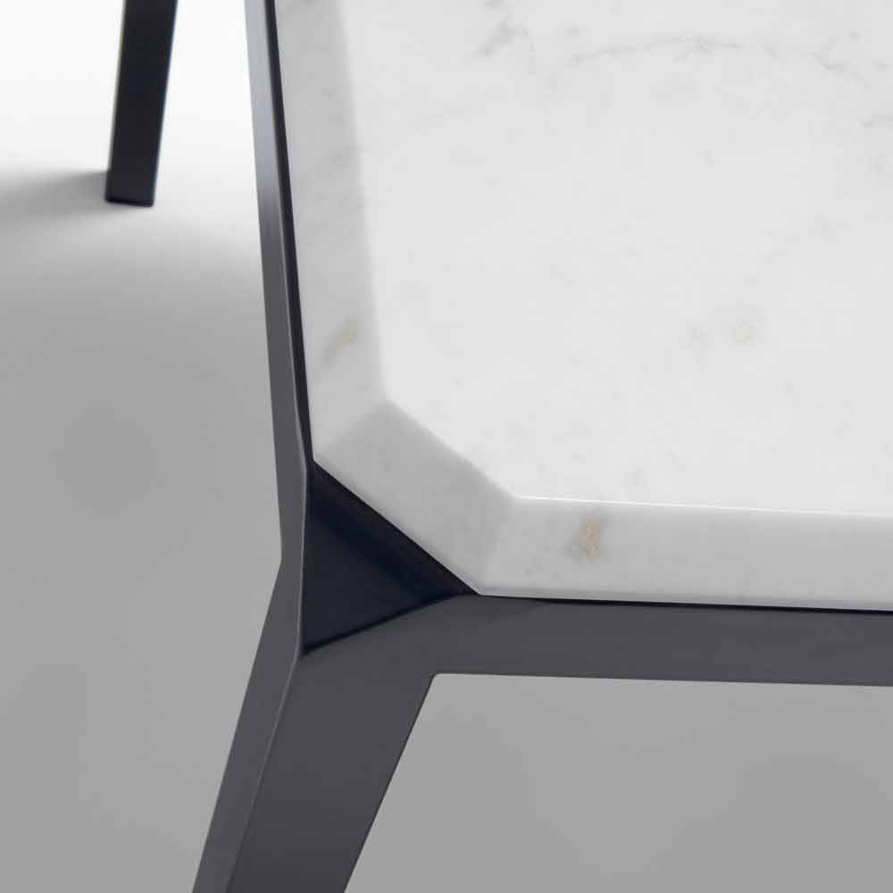 Basis in parelachtig zwart gelakt staal en bovenkant in wit Michelangelo-marmer.