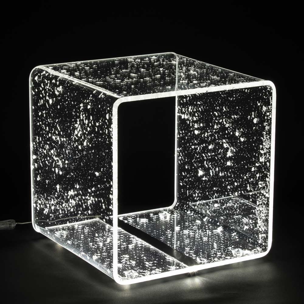 Lichtgevend nachtkastje in acrylkristal en bladgoud, zilver of koper, gemaakt in Italië.