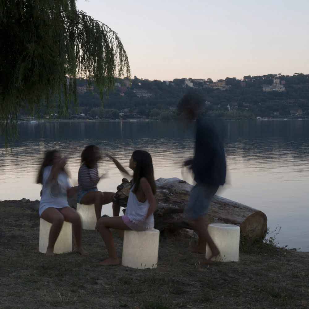 Gemaakt door In-es.artdesign voor de collectie Out in laprene en Nebulite: een innovatief materiaal gemaakt van hars en vezels, waarvan de nerven de lamp een bepaald "maan" en marmereffect geven.