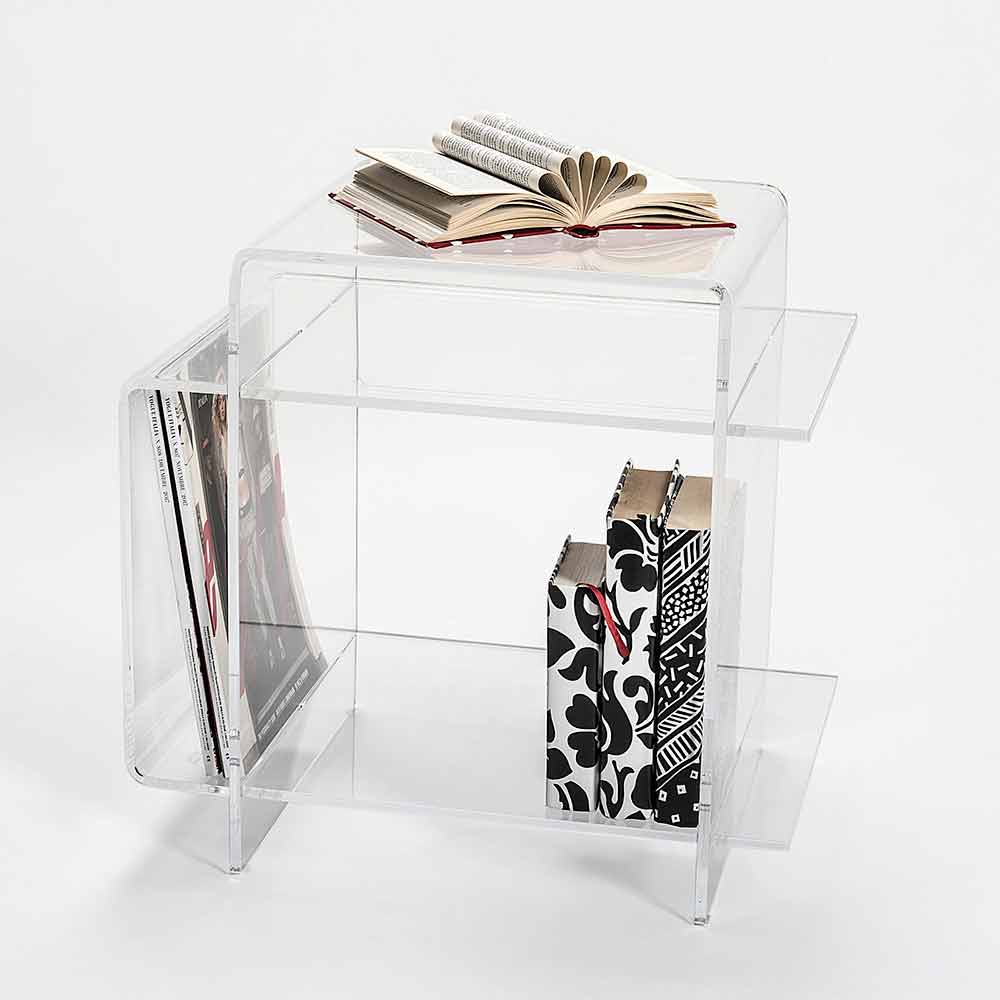 Designtafel in transparant plexiglas gemaakt in Italië, Gosto Veelzijdig bijzettafeltje / nachtkastje met 3 planken, geïnspireerd op de geometrieën van de jaren 1970, gemaakt van 100% nieuw transparant polymeer plexiglas, laser gesneden en gevouwen bij hoge temperaturen.