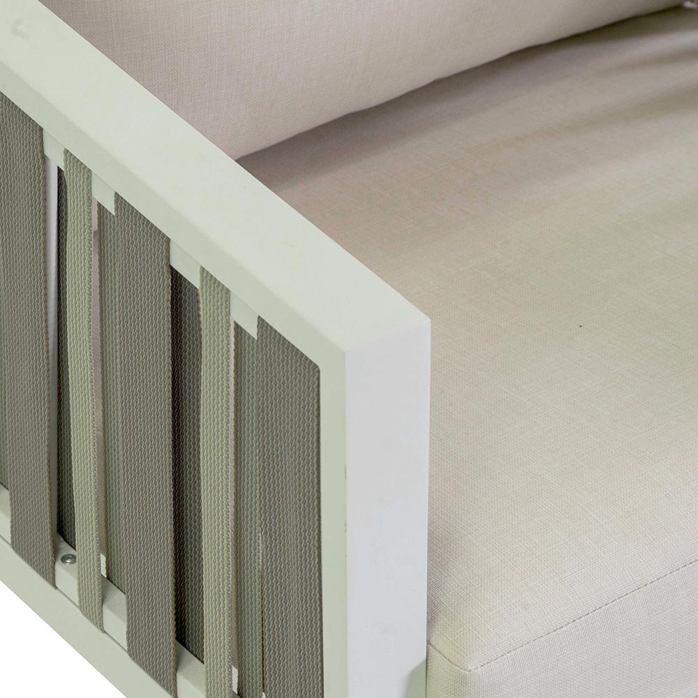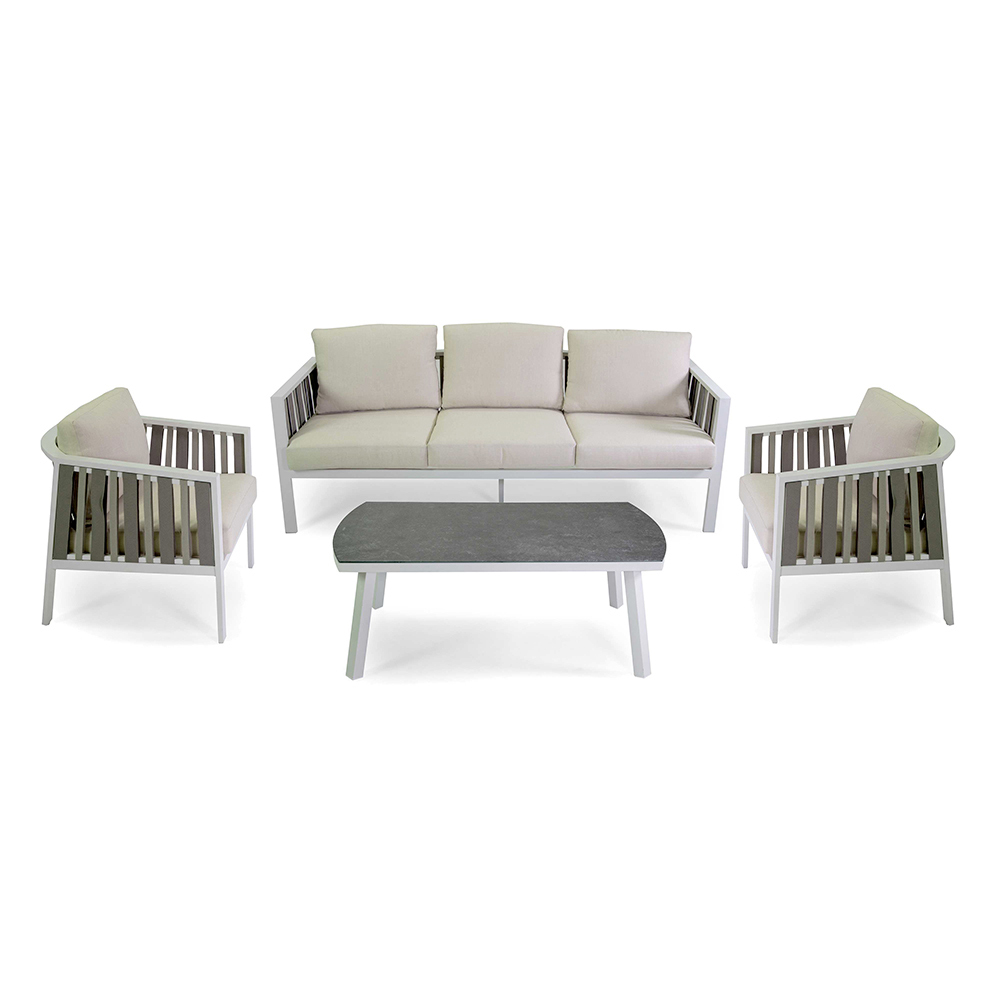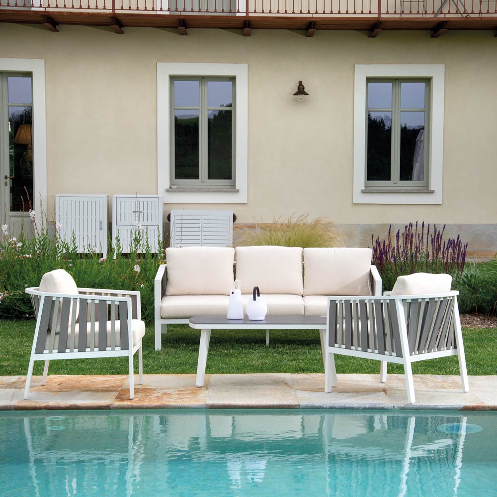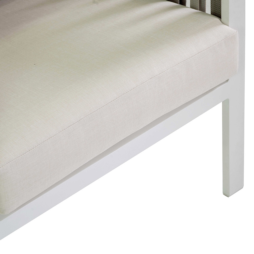 Lijne lijnen en een eigentijds ontwerp gaan samen met een keuze van hoogwaardige materialen, en bieden een strakke look die elke buitenruimte direct opwaardeert. De zittingen zijn royaal opgevuld met weerbestendige stoffen kussens, die ongeëvenaard comfort en weinig onderhoud beloven.