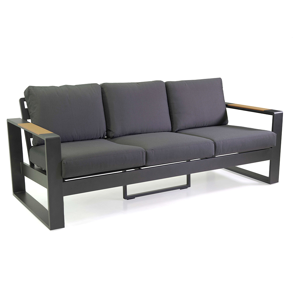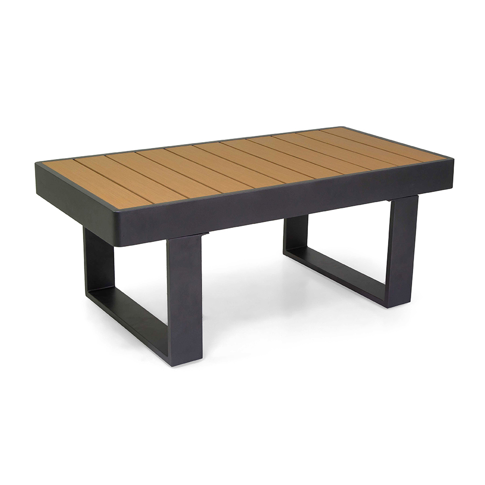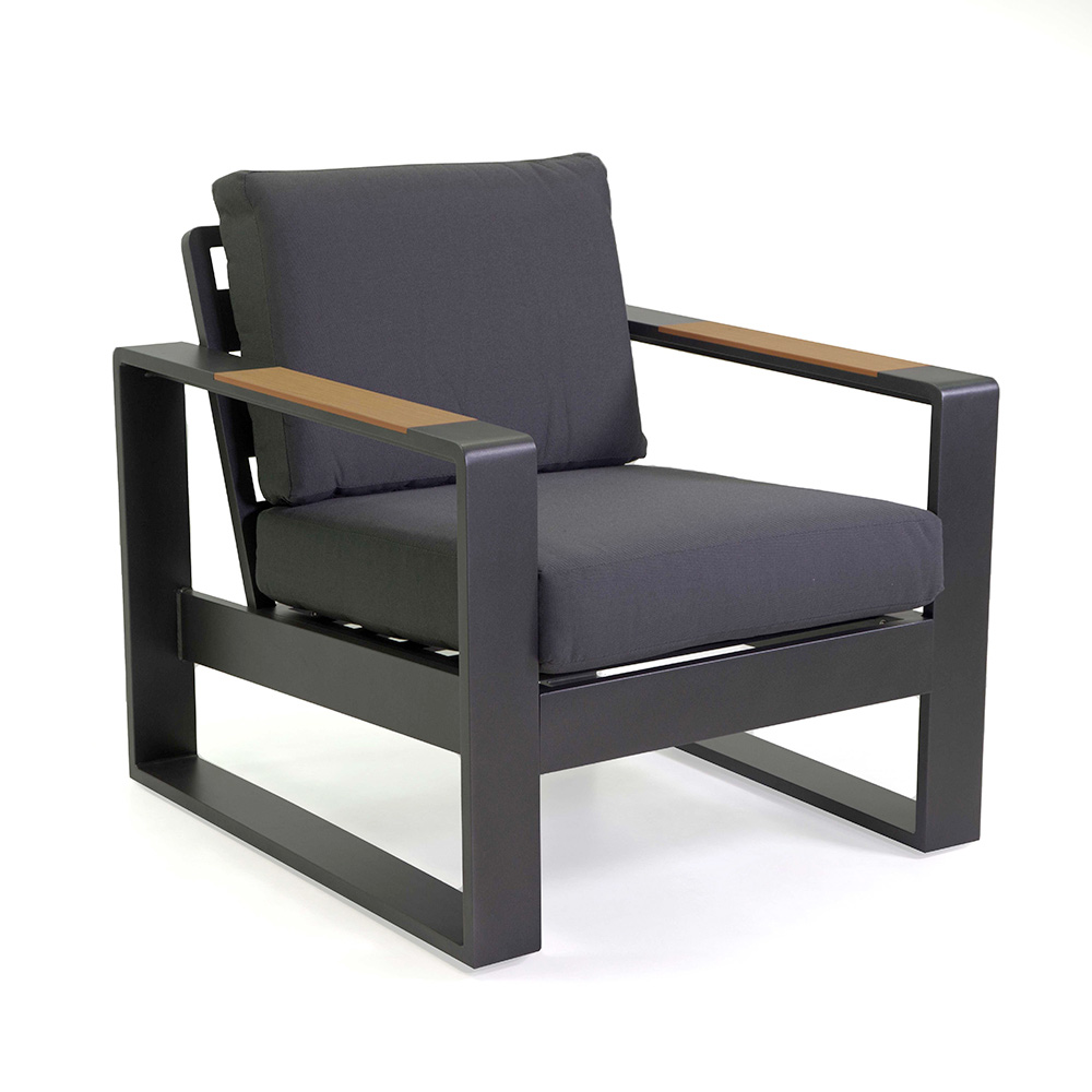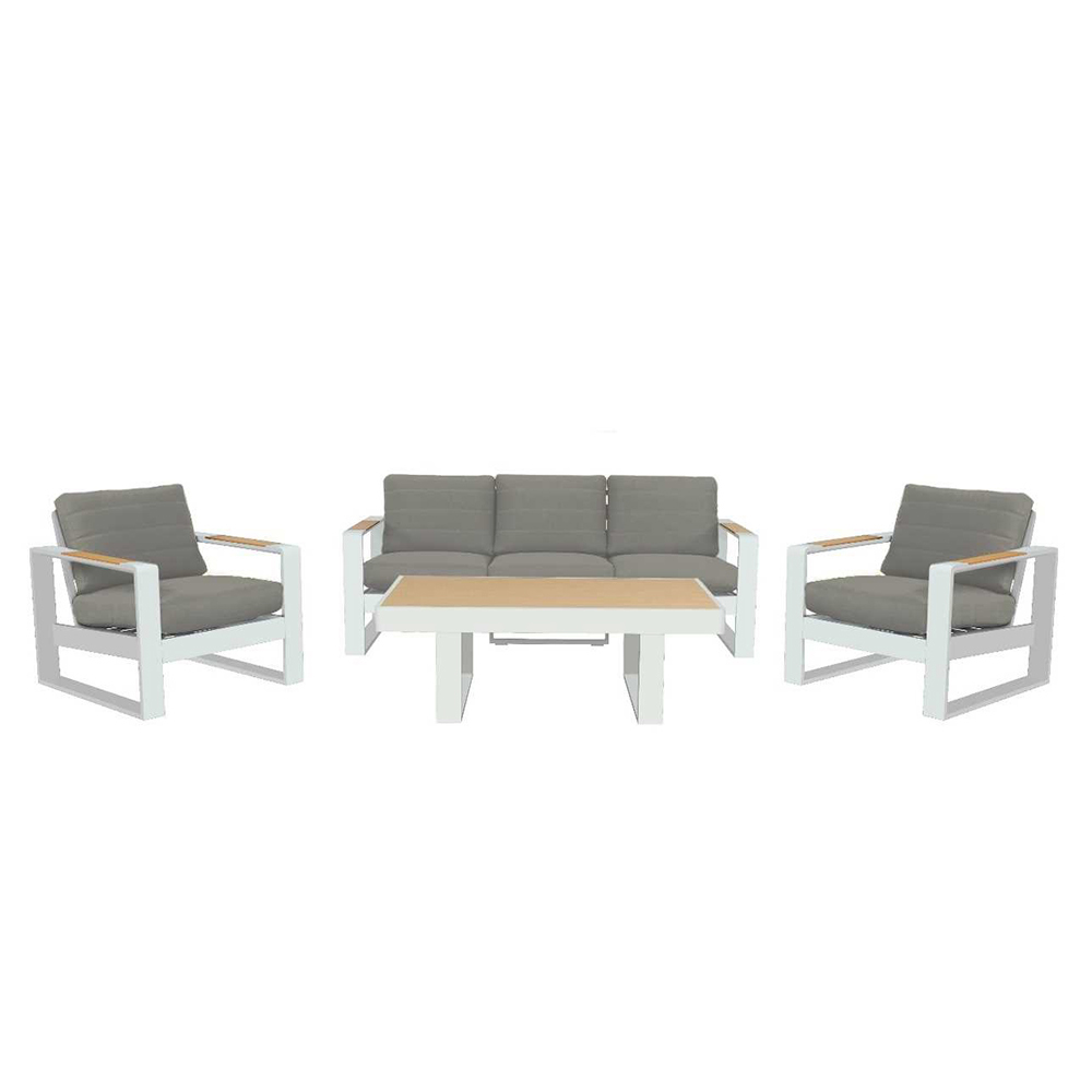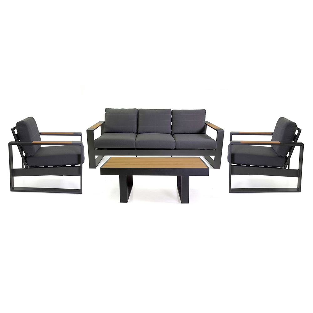 De houten armleuningen voegen een vleugje natuurlijke warmte toe die mooi contrasteert met het frame, waardoor een uitnodigende sfeer ontstaat om te ontspannen of te entertainen. De bijpassende salontafel is perfect om drankjes en snacks bij de hand te houden, waardoor deze set een uitstekende keuze is voor elke patio of tuin.