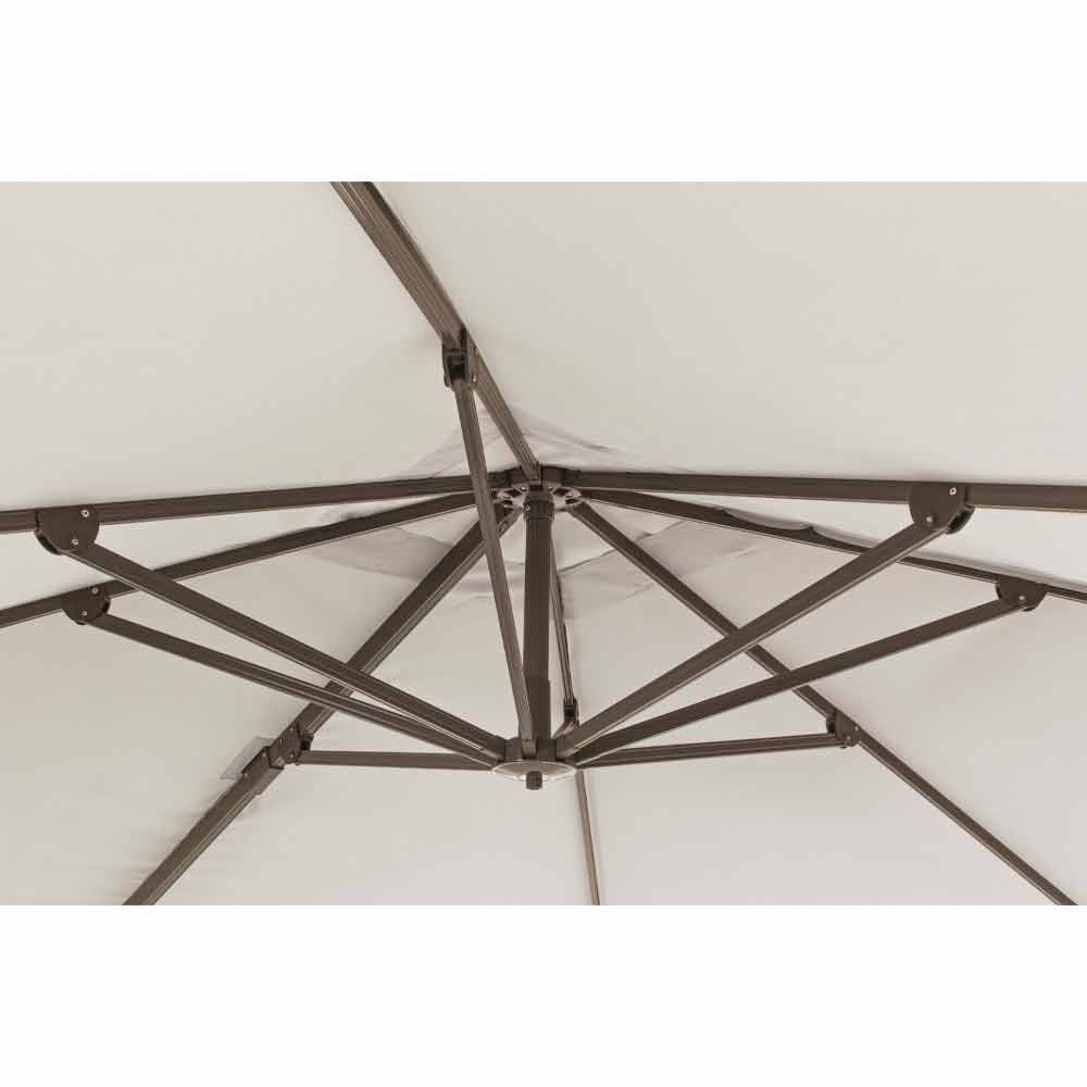 Gepoedercoate aluminium structuur (polyester). 53x77mm paal, 25x40mm hangende paal, 8 14x24mm ribben. Natuurlijke polyester stof 200gr / m2 met pa (polyamide) coating. Kruisvoet in staal . Handmatig draaibare 360 ° paal.