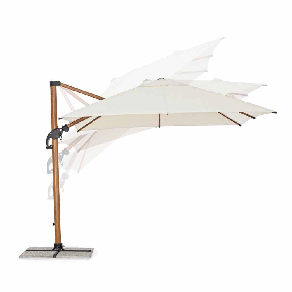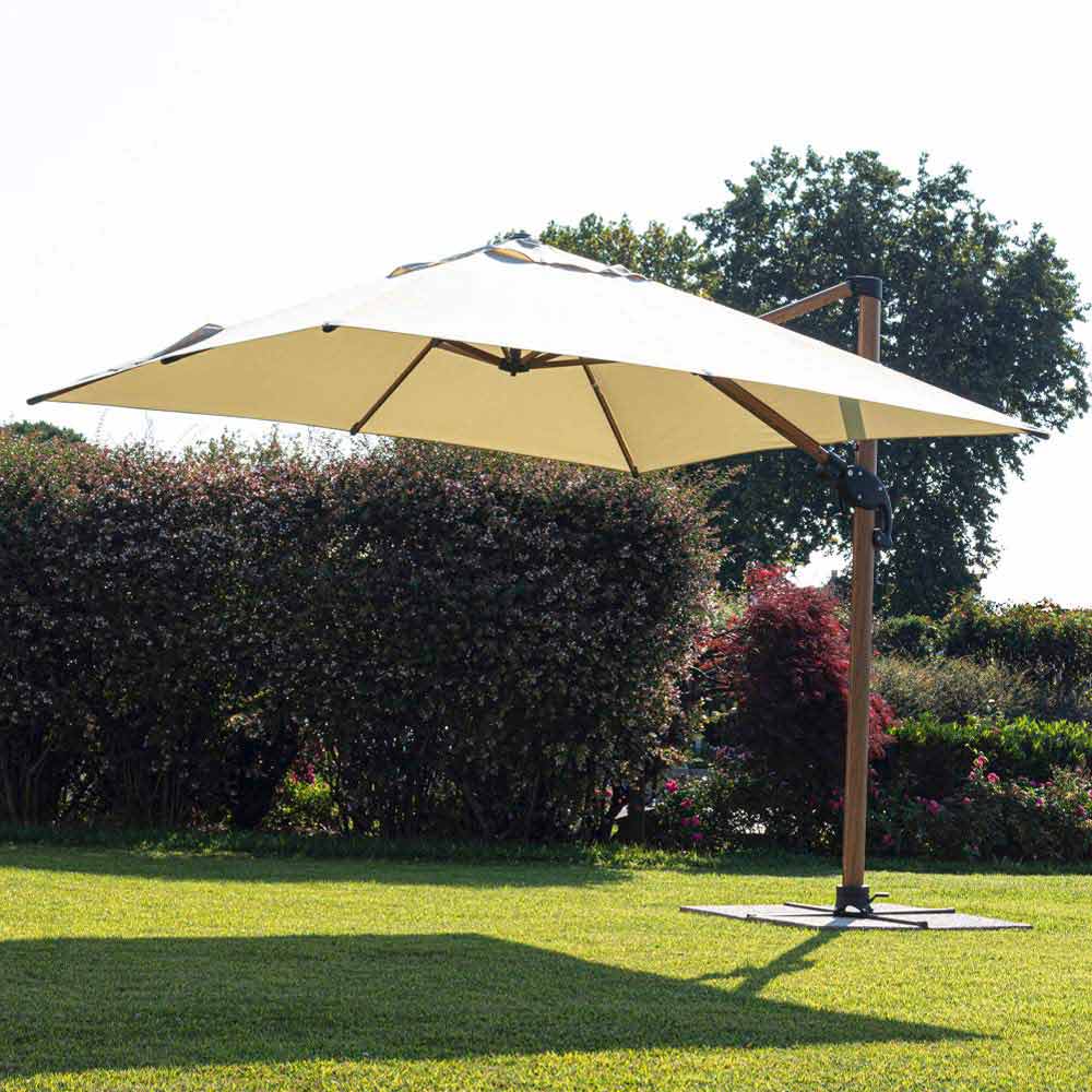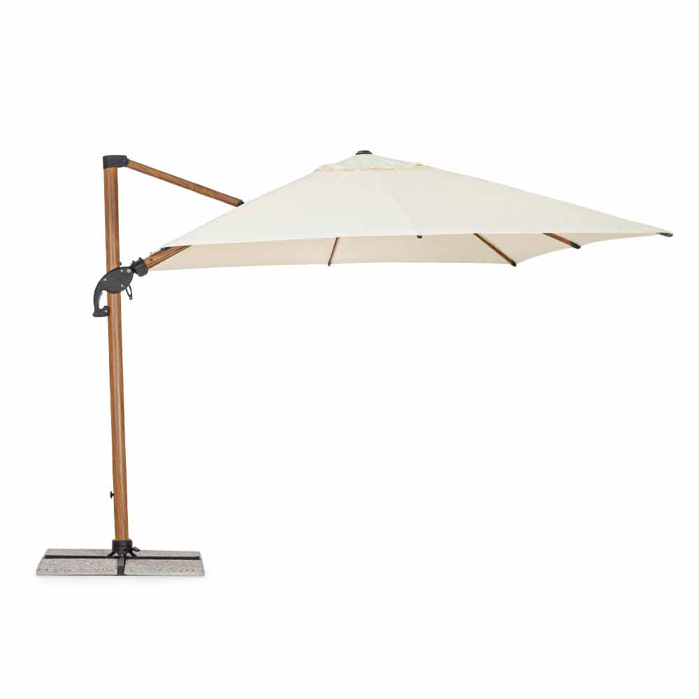 Gepoedercoate aluminium structuur (polyester) met houtdessin. 90x60mm paal, 8 ribben van 25x17mm. Beige polyester stof 250gr / m2 met pa (polyamide) coating. Kruisvoet in staal . 360 ° roterende paal met pedaal. Verticale kanteling met handgreep in 6 standen. Voorzien van rechts-links kantelsysteem voor paraplu. Inclusief parapluhoes.