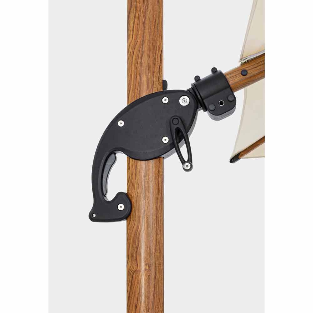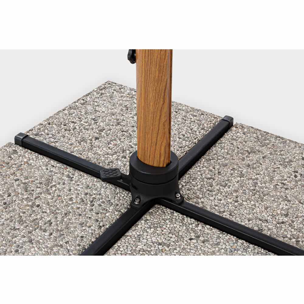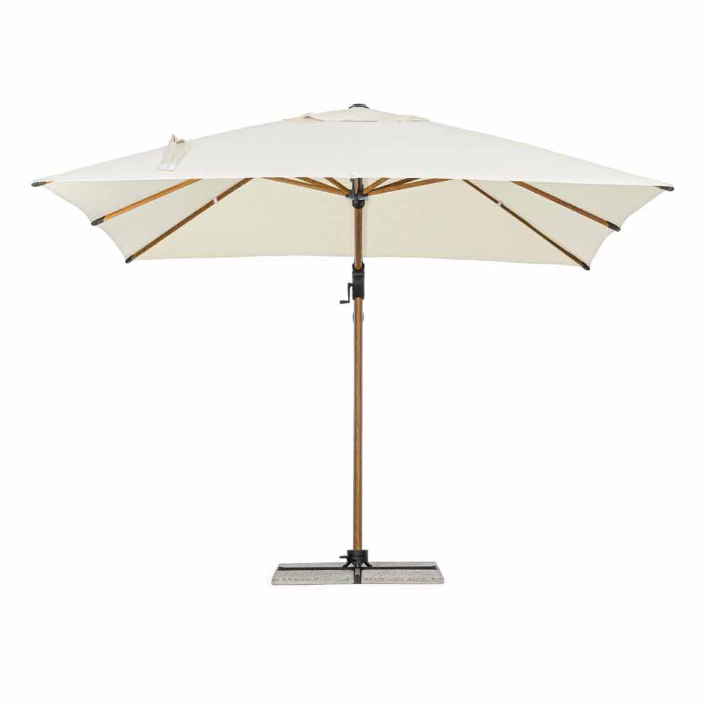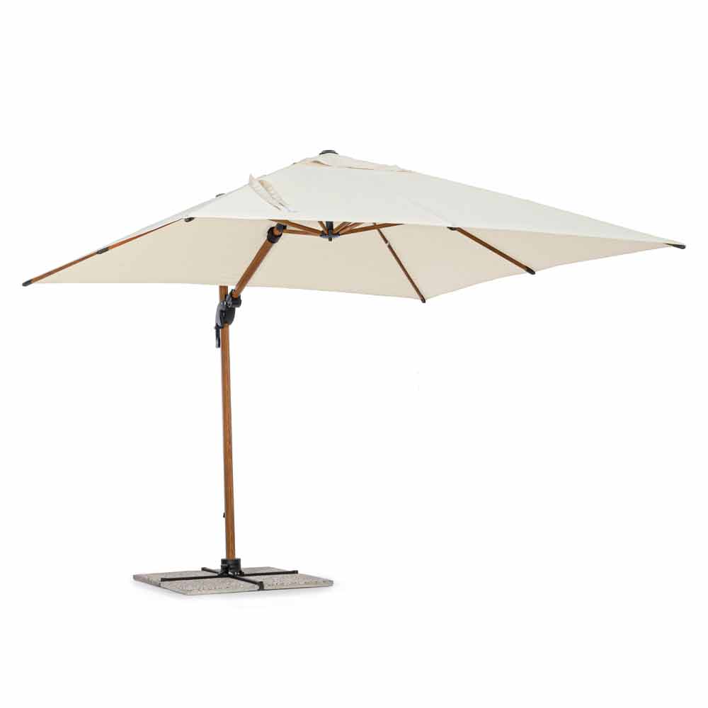 Gepoedercoate aluminium structuur (polyester) met houtdessin. 90x60mm paal, 8 ribben van 25x17mm. Beige polyester stof 250gr / m2 met pa (polyamide) coating. Kruisvoet in staal . 360 ° roterende paal met pedaal. Verticale kanteling met handgreep in 6 standen. Voorzien van rechts-links kantelsysteem voor paraplu. Inclusief parapluhoes.
