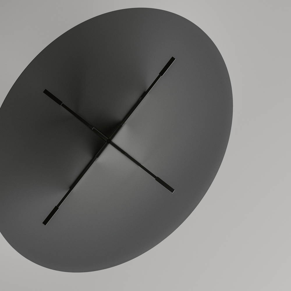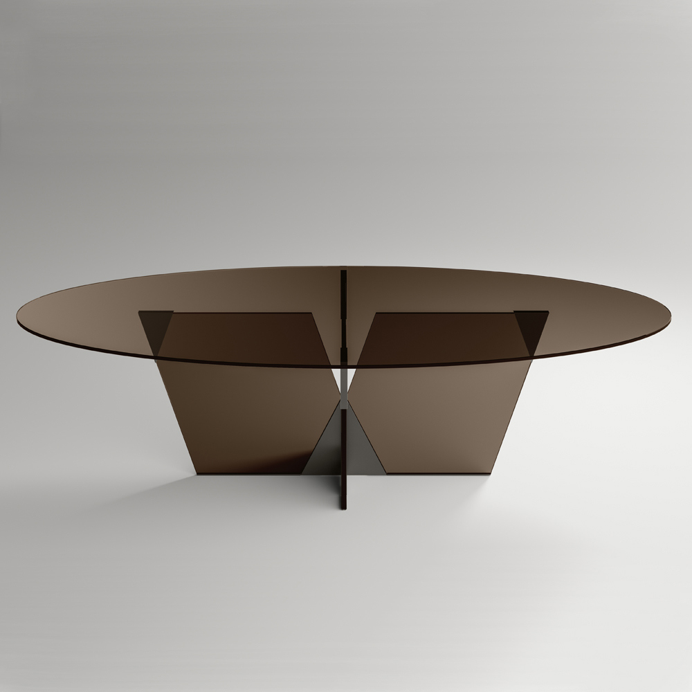 Eettafel made in Italy met ovaal blad en glazen onderstel. Het sterke punt van zijn esthetiek is de architecturale basis die wordt gekenmerkt door een piramidevormige verbinding van metaal die het essentiële onderdeel van het product vormt. De metalen elementen vervolledigen het ontwerp van de tafel, geven vorm aan het glas van het onderstel en verrijken het met persoonlijkheid en originaliteit.