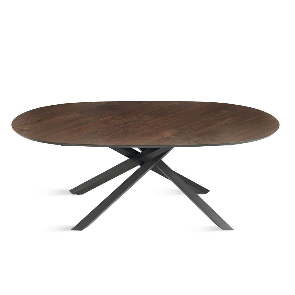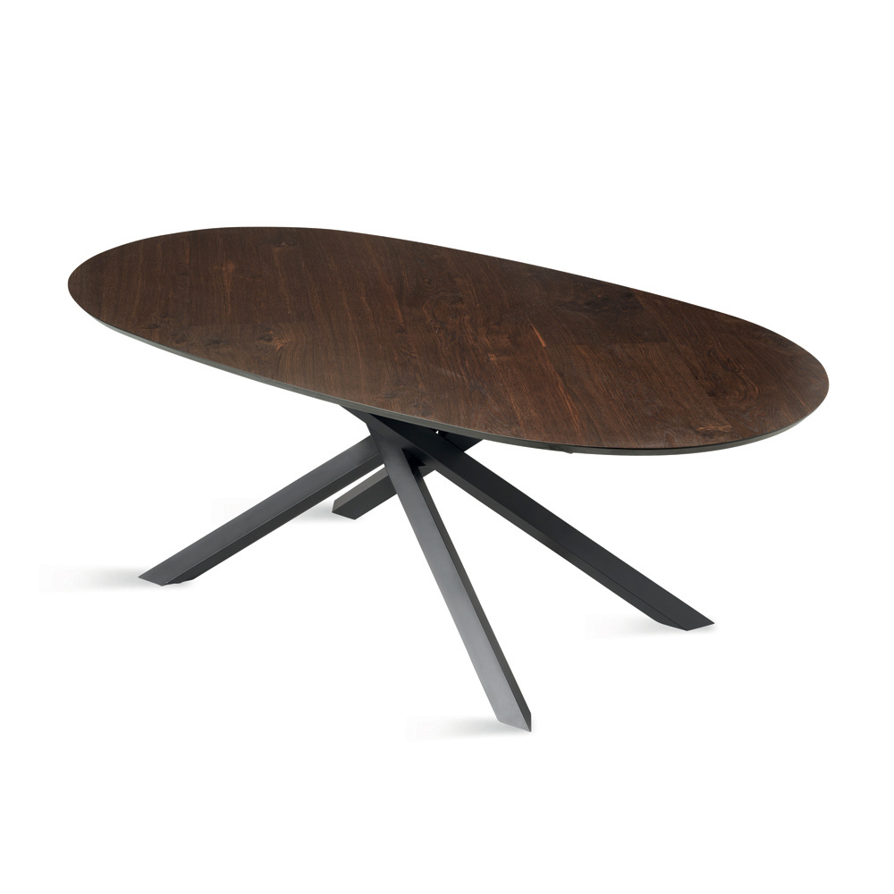 Een elegante design eettafel, Made in Italy, ontworpen om uw eetkamer of woonkamer stijlvol in te richten. De tafel valt op door het verfijnde ovale blad van eikenfineer , met een zacht profiel dat gezelligheid bevordert en een natuurlijke elegantie aan de ruimte geeft.