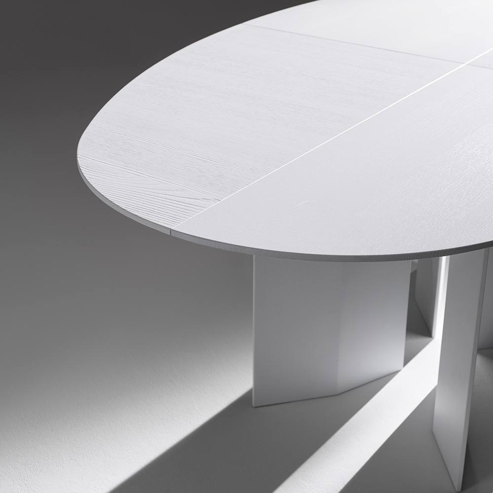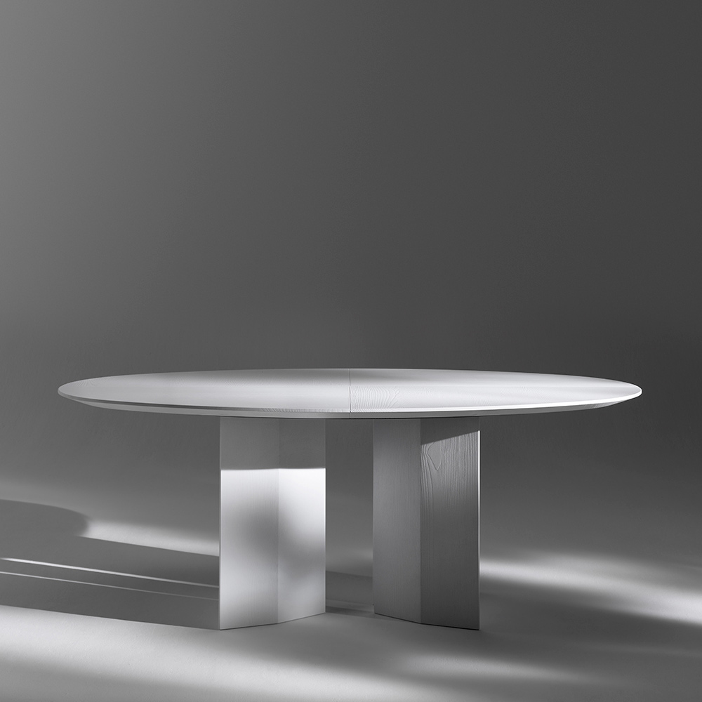 Deze ovale eettafel valt op door zijn sculpturale en minimalistische ontwerp, waarbij volle volumes en uitgebalanceerde proporties een visueel aantrekkelijk meubelstuk creëren. Het ovale tafelblad sluit naadloos aan op de centrale voet, waardoor een solide en harmonieuze compositie ontstaat, ontworpen voor eigentijdse en verfijnde interieurs.