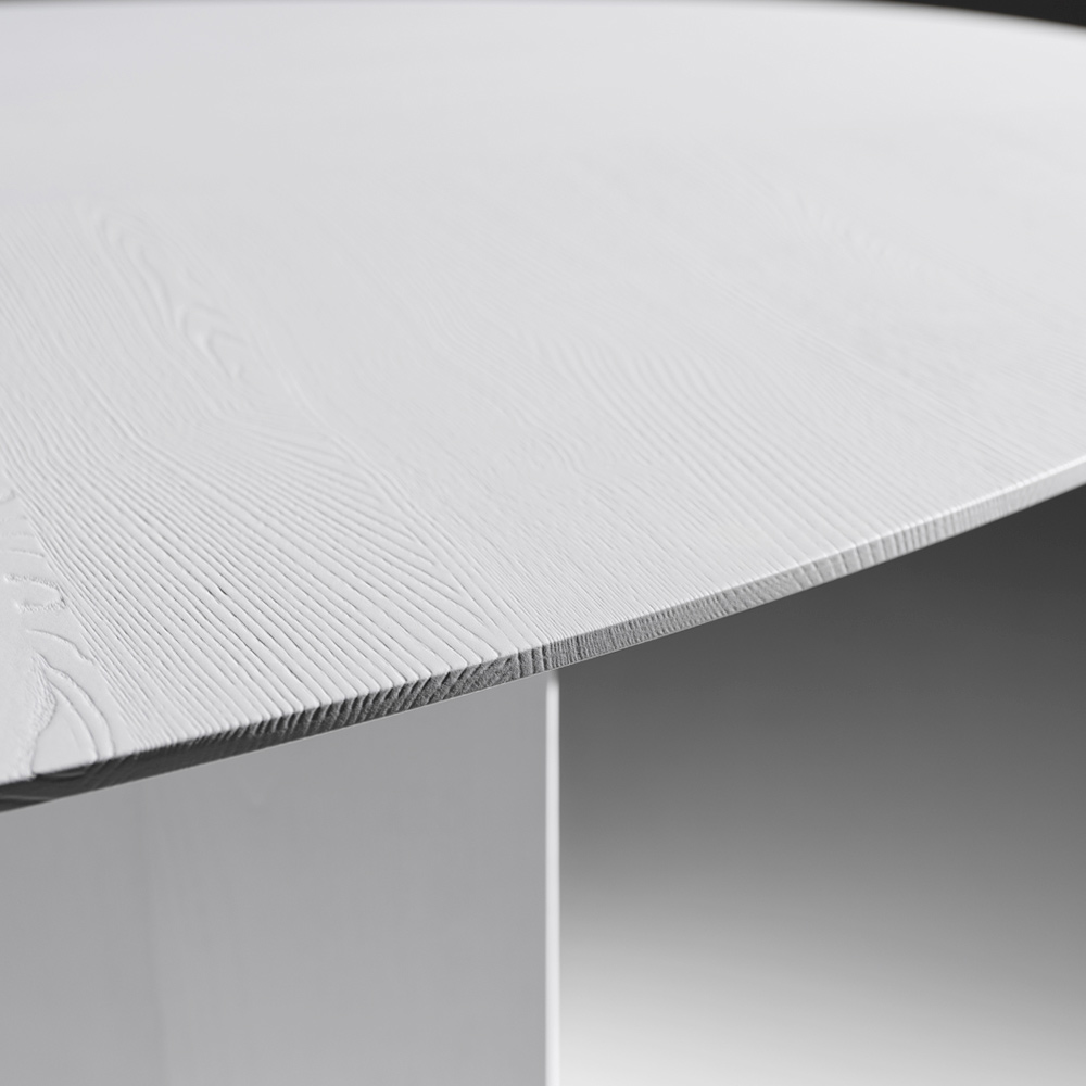 De tafel is vervaardigd uit hittebehandeld essenhoutfineer , waardoor de natuurlijke houtnerf prachtig tot zijn recht komt en de textuur en kleurdiepte worden versterkt. Hij is ook verkrijgbaar in zwart of wit lak , waardoor hij veelzijdig genoeg is om zich aan te passen aan diverse stijlen, van minimalistisch tot gedurfd en grafisch.