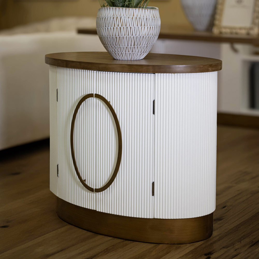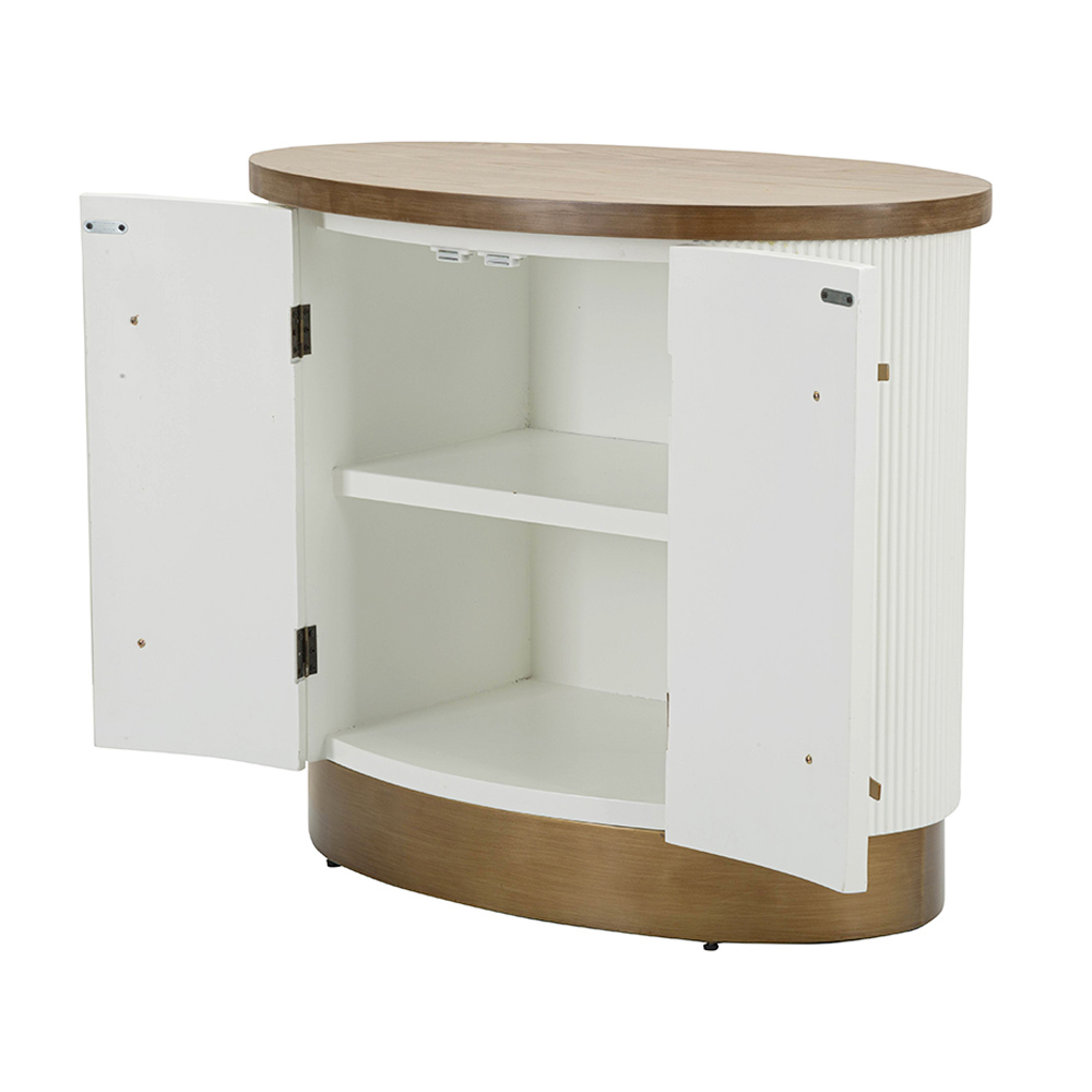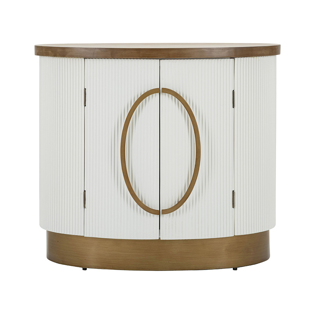 De ingenieuze groef van de deuren voegt een delicaat spel van licht en schaduw toe, terwijl de ronde handgrepen een vleugje verfijning introduceren. Dit meubelstuk biedt niet alleen een esthetisch aandachtspunt, maar ook een overvloedige opbergcapaciteit, waardoor het even praktisch als mooi is.