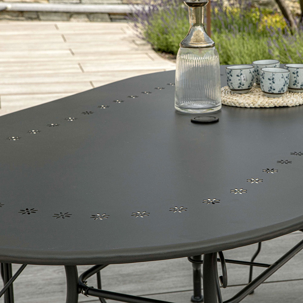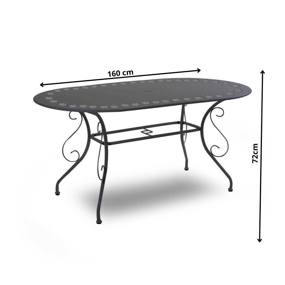 Deze ovale metalen tafel is een perfecte keuze voor wie praktisch en stijlvol wil combineren. Met zijn stevige frame en elegante, gebogen poten biedt het een ideale ontmoetingsplaats voor gezellige momenten in de buitenlucht.
