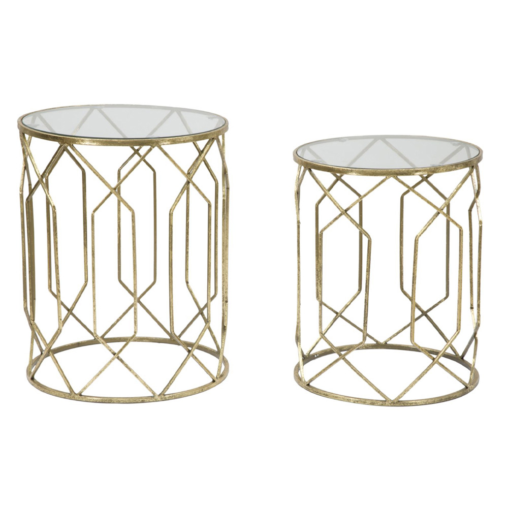 Paar ijzeren salontafels met rond transparant glazen blad.