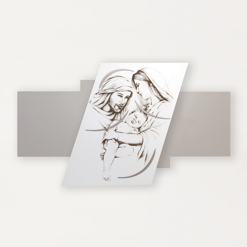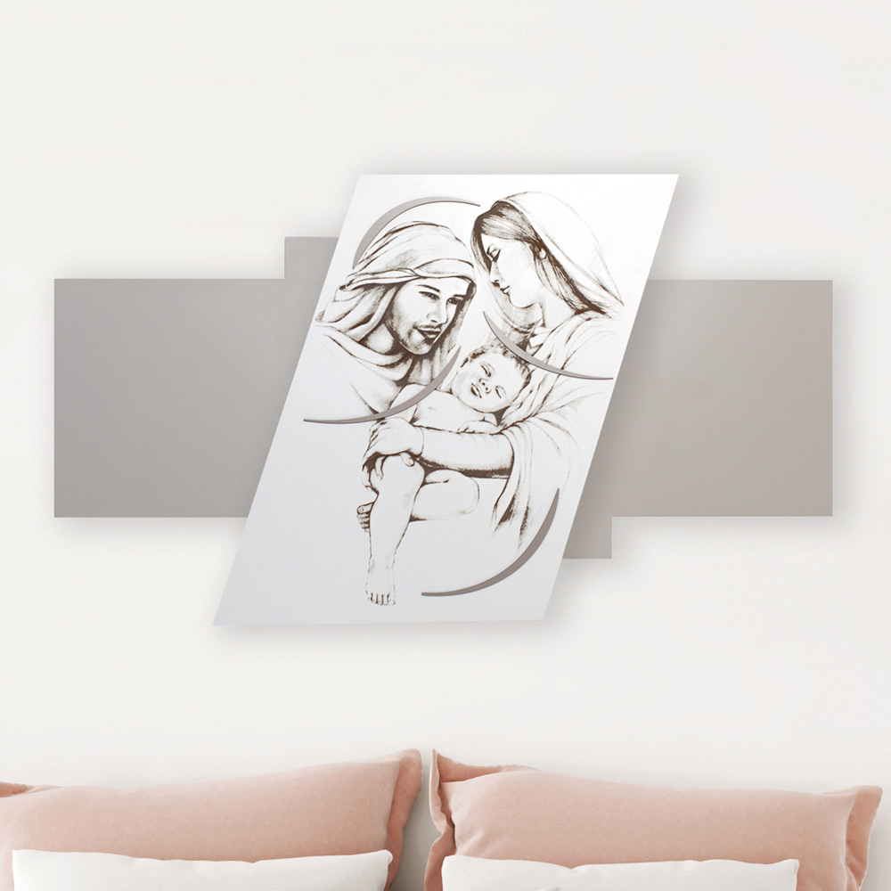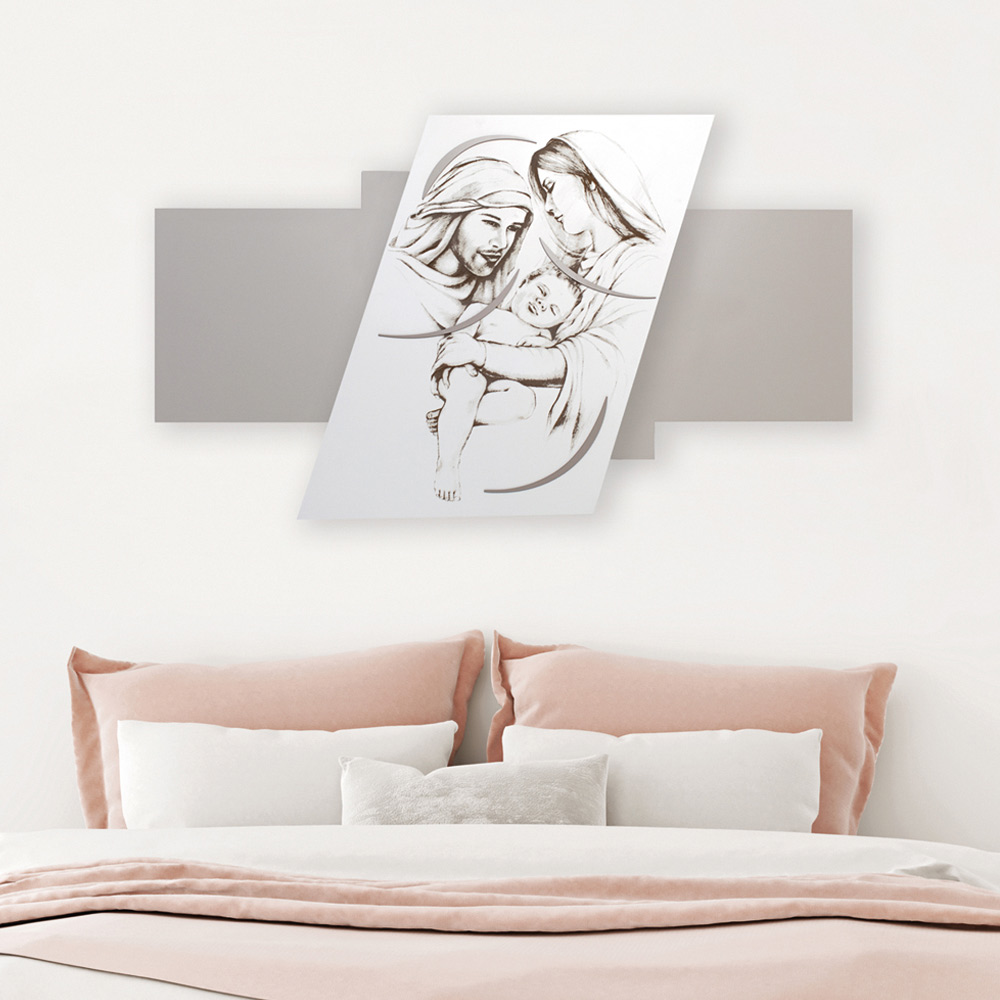 Het vertegenwoordigt de Heilige Familie in lasermarkering, het is een hoofdeinde met een minimaal ontwerp dat perfect is voor moderne omgevingen. Lasergegraveerd ondoorzichtig wit gelakt houten paneel op een kiezelkleurig paneel met grinddecoraties die een religieus tafereel uitbeelden.