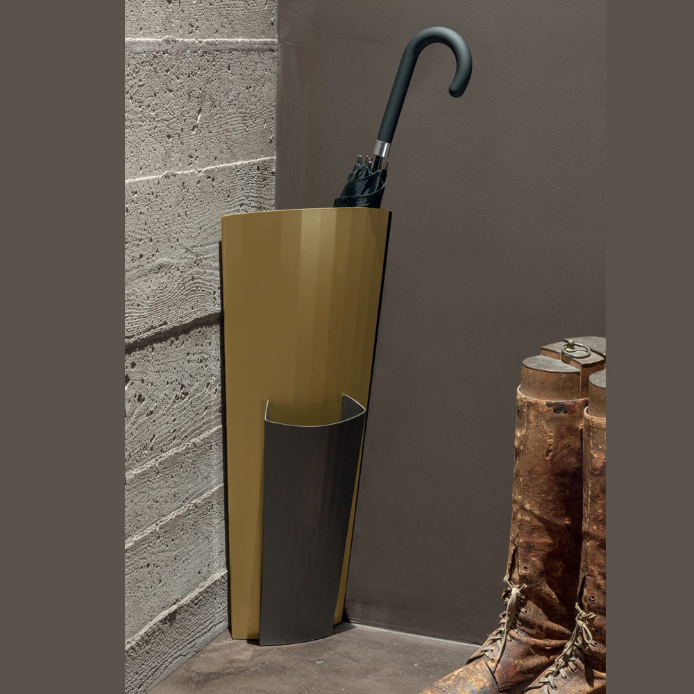 gemaakt in Italië. Paraplubak met een origineel en functioneel ontwerp. Het heeft een structuur van zwart en goudgeverfd plaatstaal, verfraaid met gefacetteerd vakmanschap dat doet denken aan een elegante plooi. Deze paraplubak vervult niet alleen zijn primaire functie effectief, maar voegt ook een vleugje elegantie en stijl toe aan de entree van uw huis of kantoor dankzij het onderscheidende ontwerp en de hoogwaardige materialen die bij de constructie zijn gebruikt.