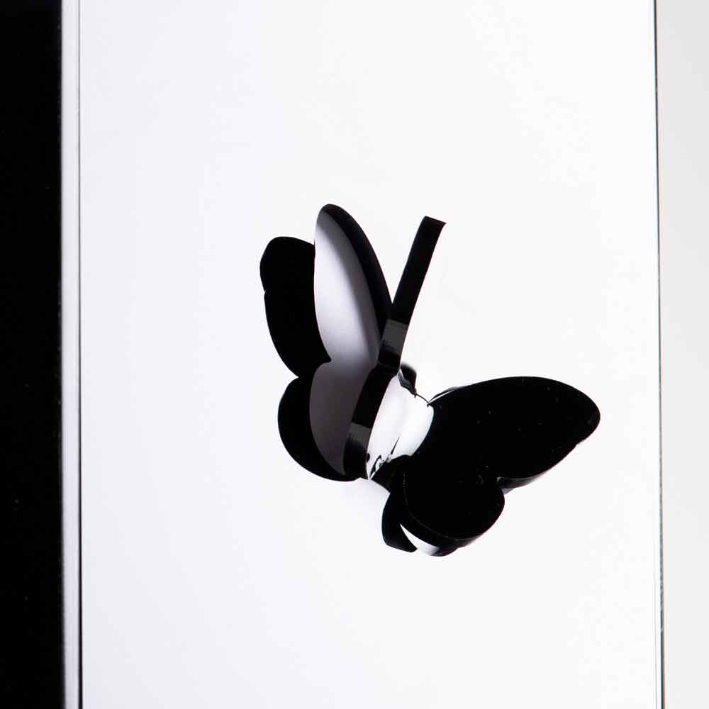 De paraplubak van zwart plexiglas kenmerkt zich door de voorstelling van lasergemarkeerde wintertakken en driedimensionaal gedecoreerde vlinders en een roestvrijstalen voet.