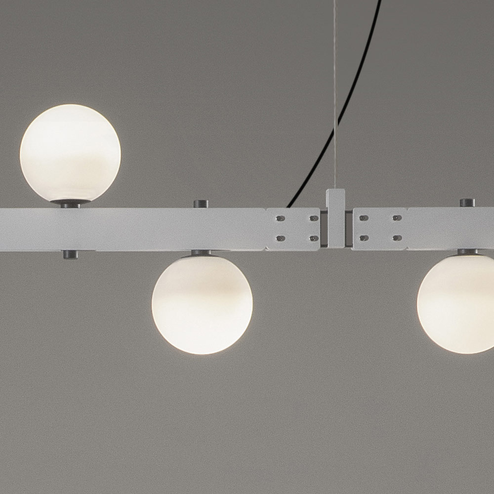 De dragende staven herinneren aan de technische constructies uit het verleden en de geëlektrificeerde modulaire constructies ondersteunen verlichtingslichamen ( geblazen glazen bollen en spots ) die in hoeveelheid en vrije opstelling kunnen worden geplaatst, zonder het gebruik van elektrische stroomkabels, voor maximale expressieve vrijheid. .
