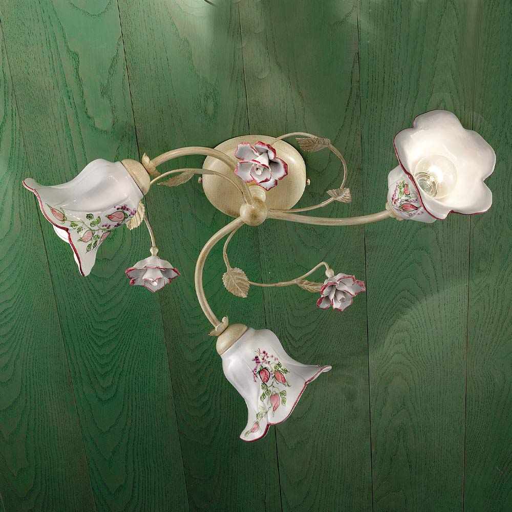 3 lichts plafondlamp in metaal en keramiek met handgeschilderde rozen gemaakt in Italië door Ferroluce.