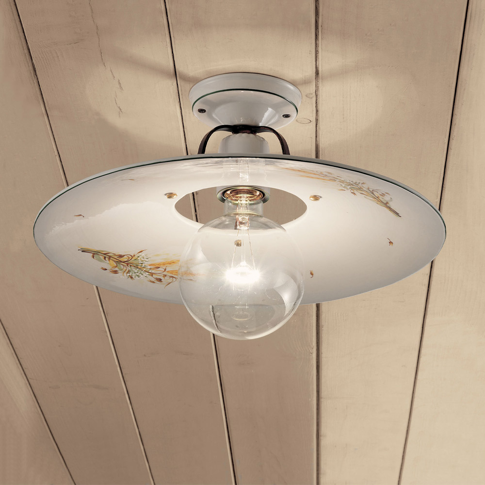 Vintage plafondlamp in ruw ijzer en keramiek met handversieringen, 2 maten gemaakt in Italië door Ferroluce.