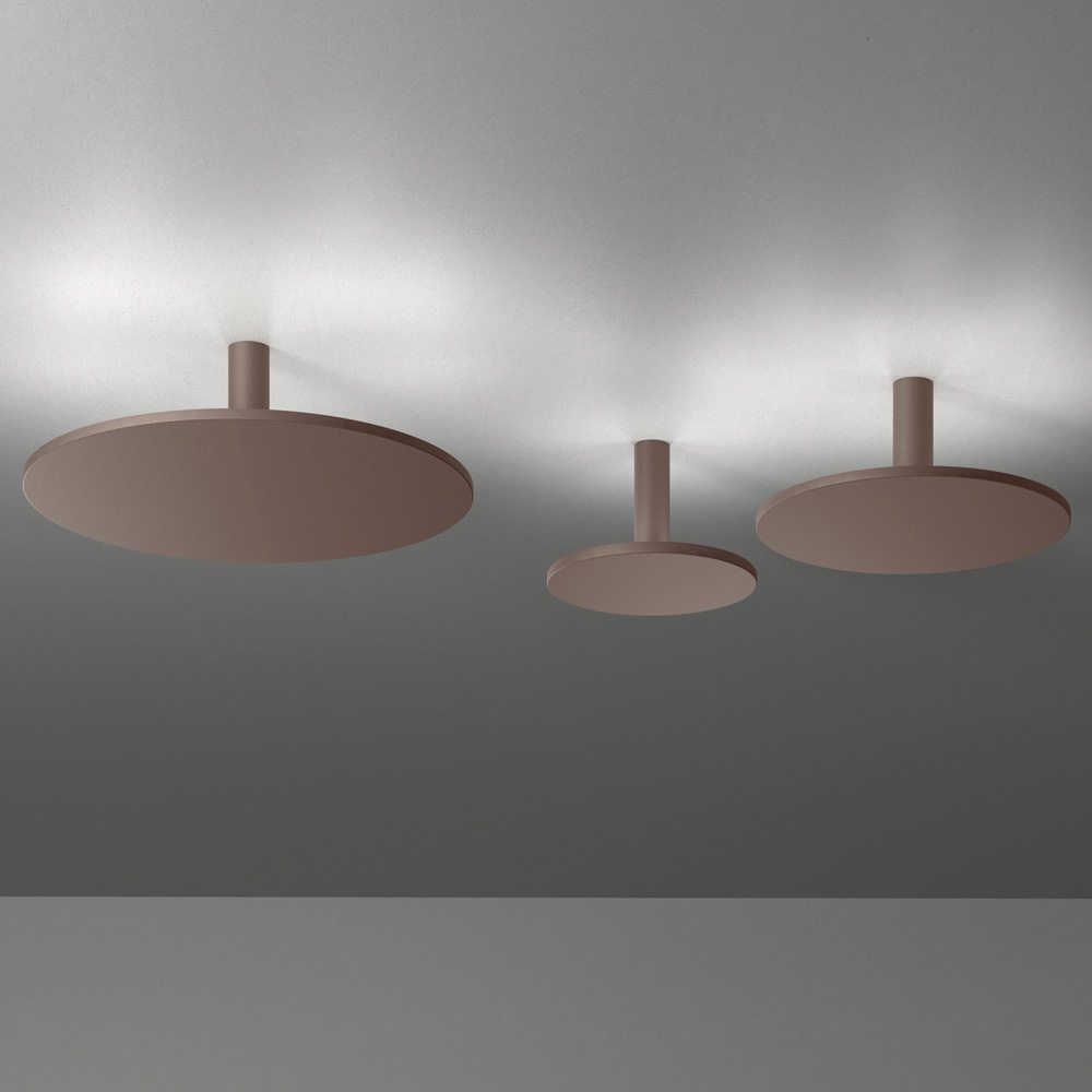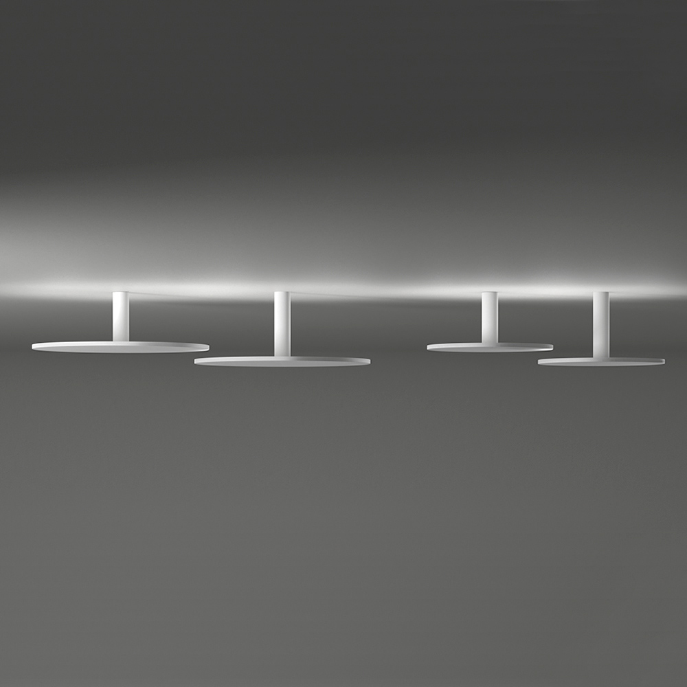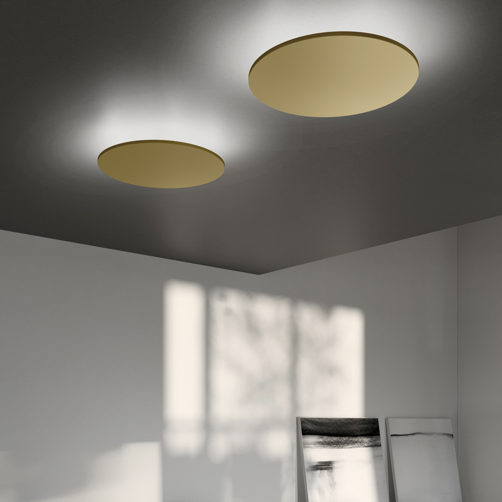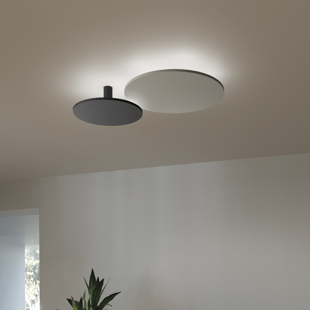 Deze plafondlamp is een verfijnd voorbeeld van hedendaags design , waarbij geometrie en licht samensmelten tot een subtiel maar indrukwekkend scenografisch effect. De mogelijkheid om composities van overlappende schijven te creëren, met verschillende formaten en afwerkingen, genereert een indirect, diffuus licht dat de omgeving verfraait met elegantie en visuele harmonie .
