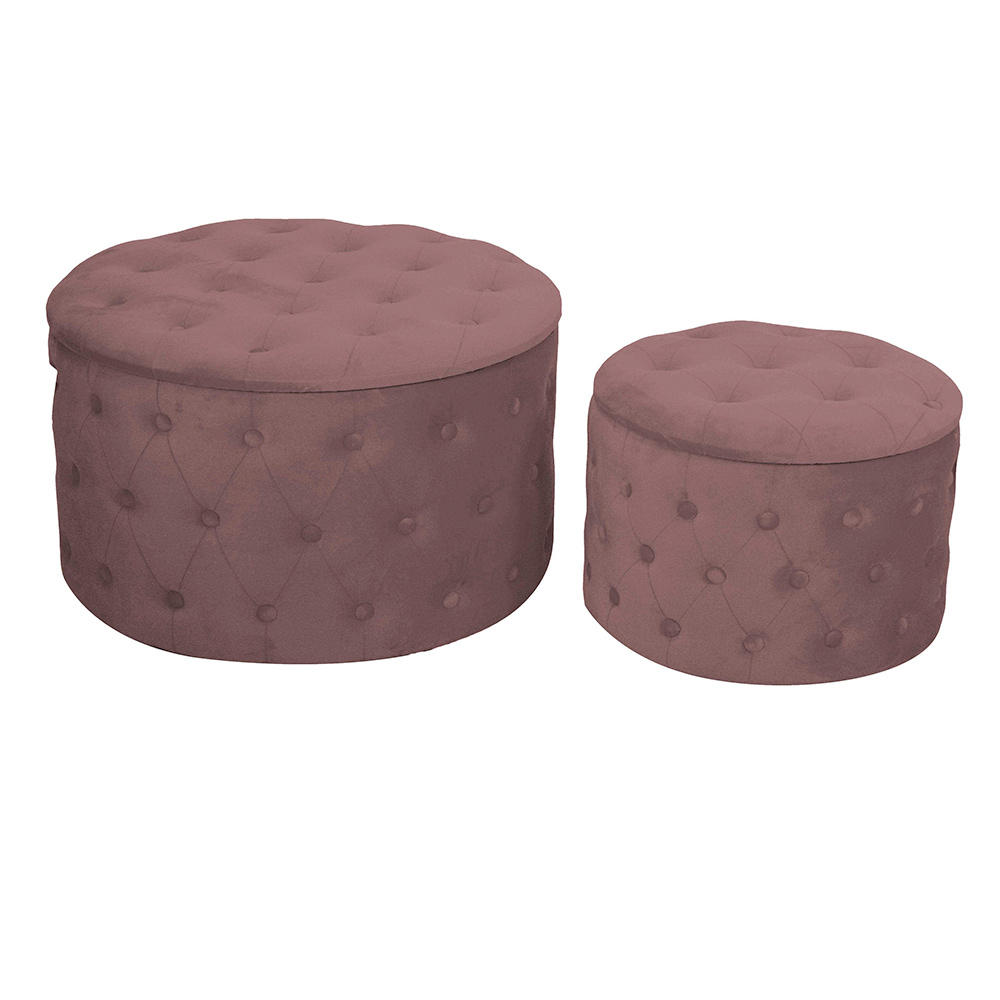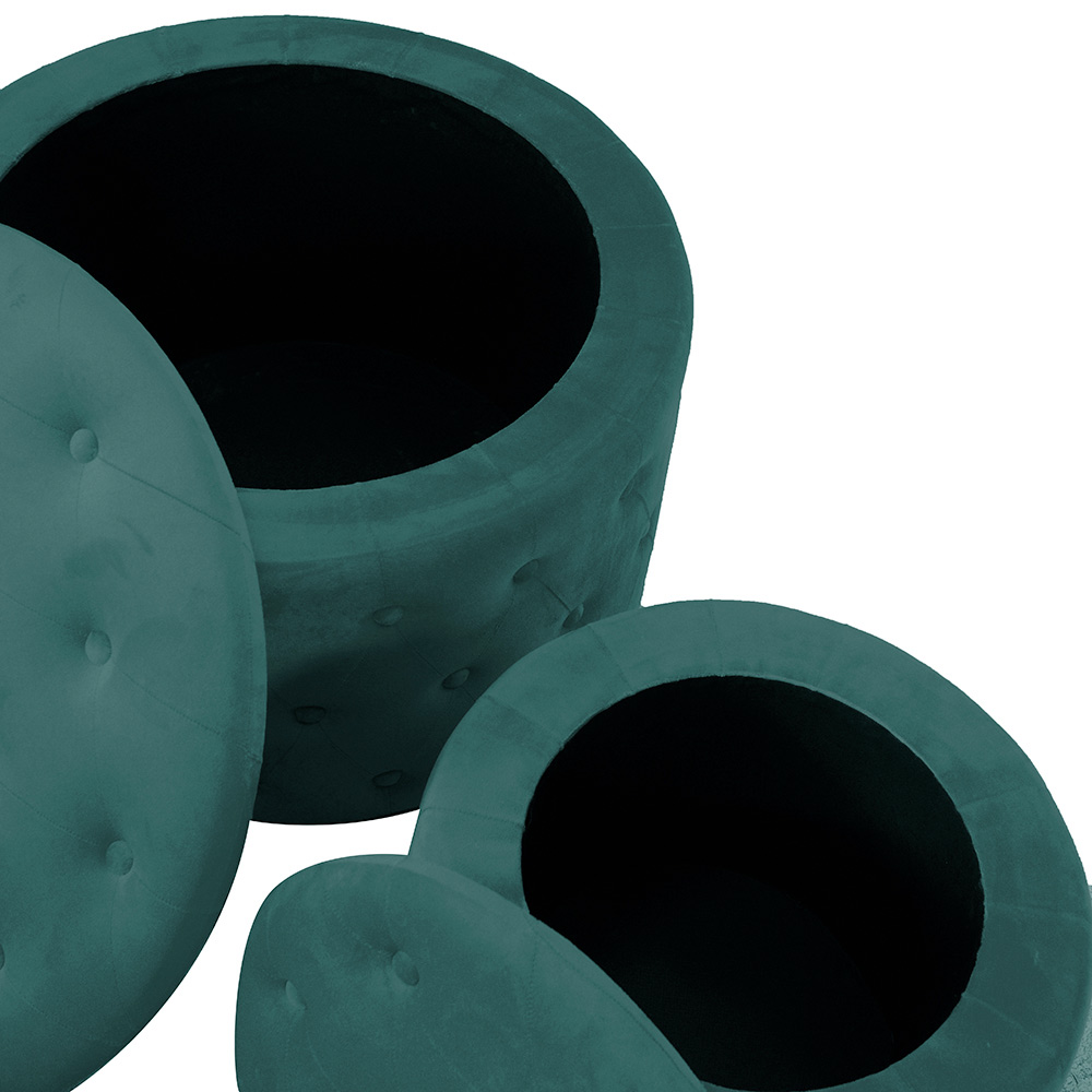 Deze set van opberg poefen is de perfecte aanvulling om elegantie en functionaliteit te combineren in elke kamer van het huis. Bedekt met een verfijnde velours , deze poefs onderscheiden zich door hun geknoopte capitoné ontwerp, dat een vleugje klasse en sofisticatie toevoegt aan uw woonkamer, slaapkamer of entree.