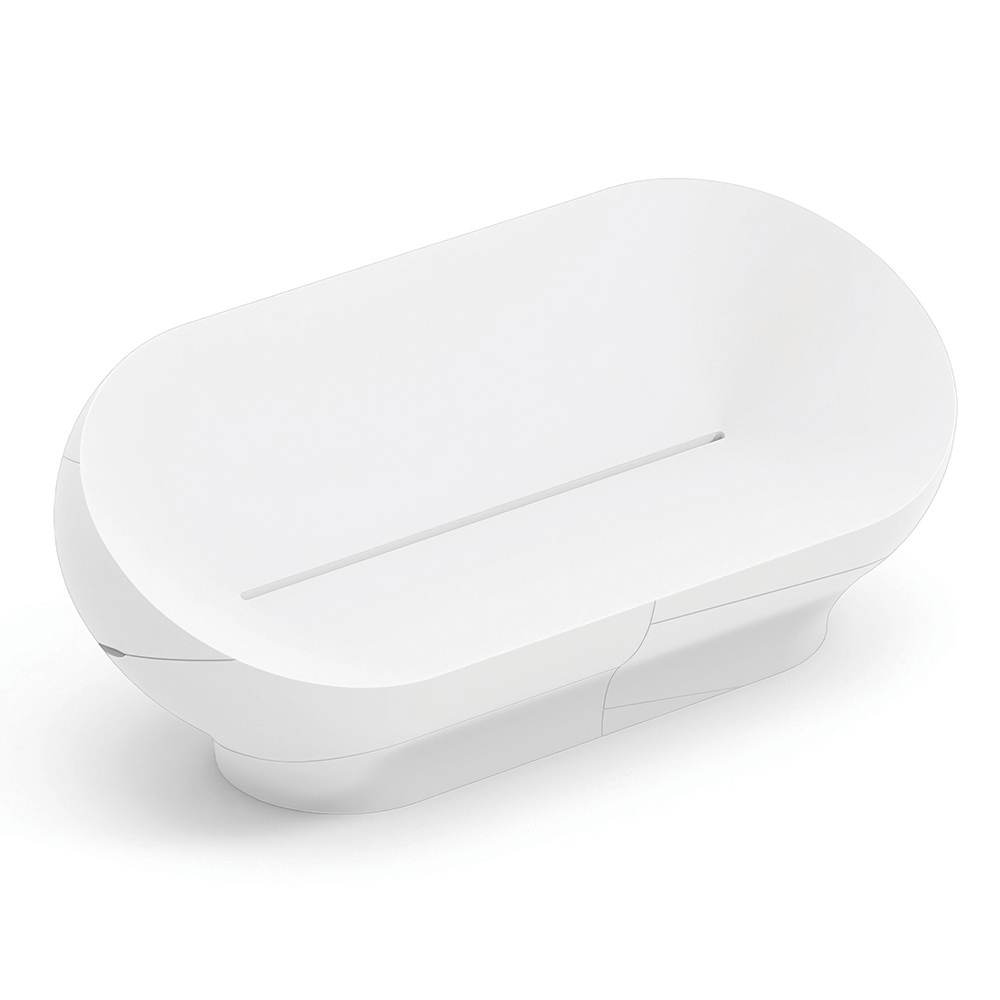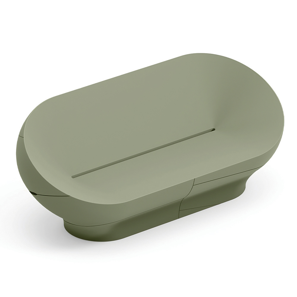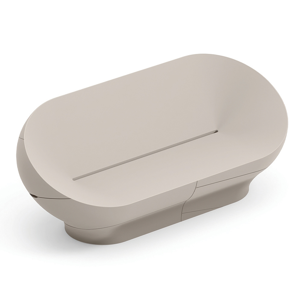 Deze bank valt op door zijn zachte, omhullende lijnen , geïnspireerd op natuurlijke vormen, die een harmonieus en eigentijds visueel effect creëren. De compacte, vloeiende monoblokstructuur geeft karakter aan ruimtes met behoud van een eenvoudige, elegante uitstraling.