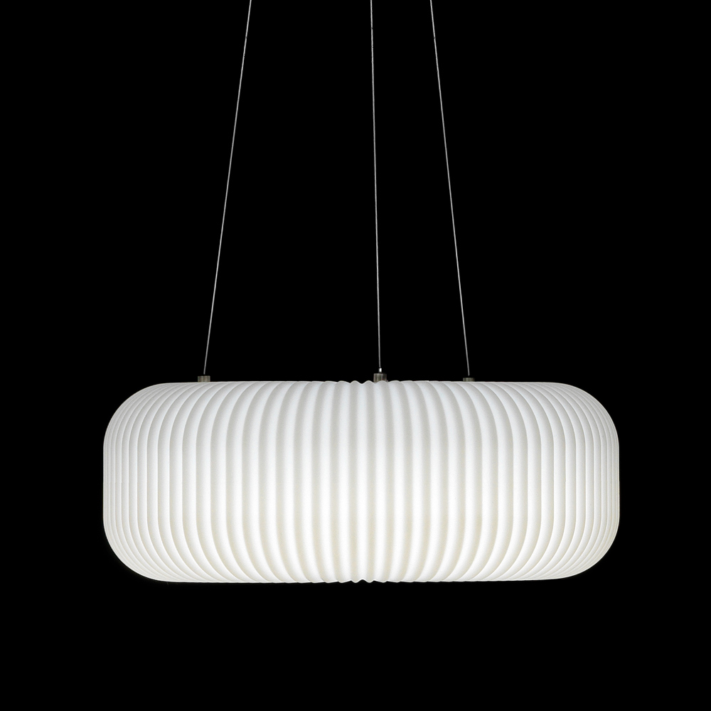 Deze lamp valt op door zijn elegante en minimalistische ontwerp, dat dunne metalen kabels combineert met een organisch gevormde kunststof diffuser. Het plastic, bewerkt met geplooide details, voegt een vleugje visuele verfijning toe en helpt het licht zacht en gelijkmatig te verspreiden, waardoor een gastvrije en ontspannen sfeer ontstaat.
