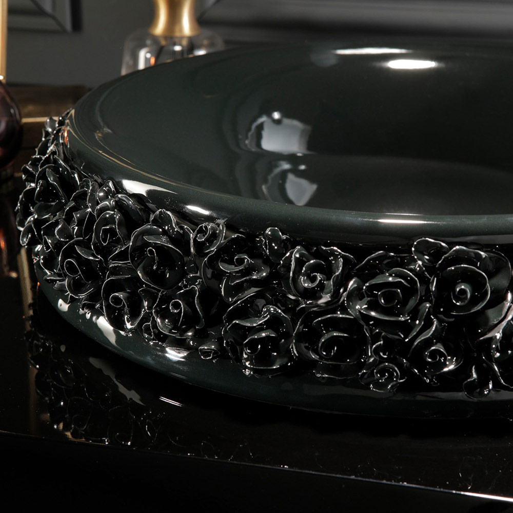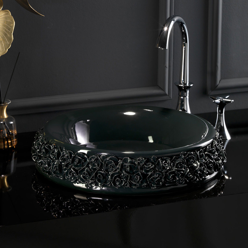 - glanzend zwarte wastafel met zwarte bloemblaadjes