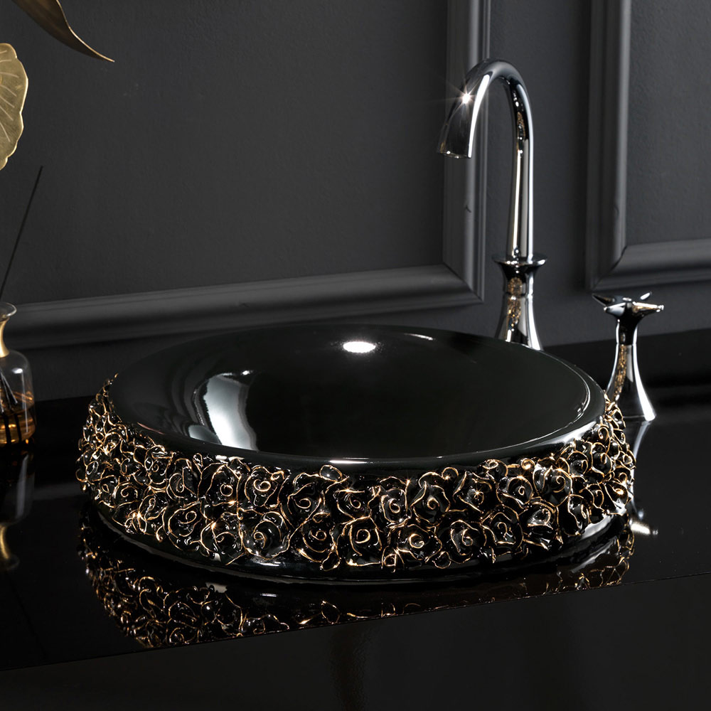 - glanzend zwarte wastafel met gouden bloemblaadjes